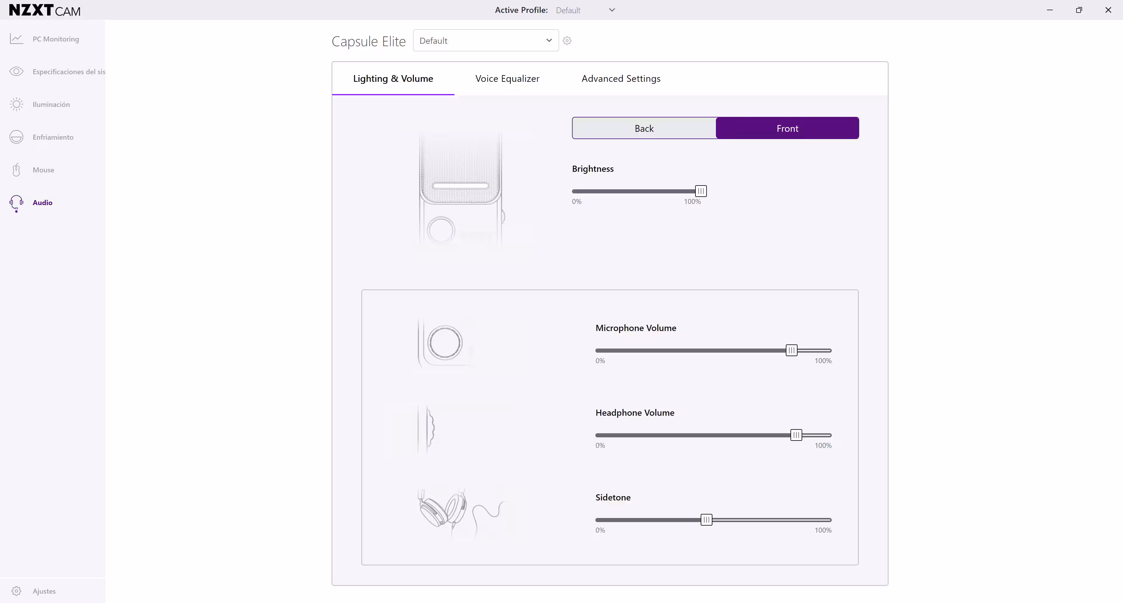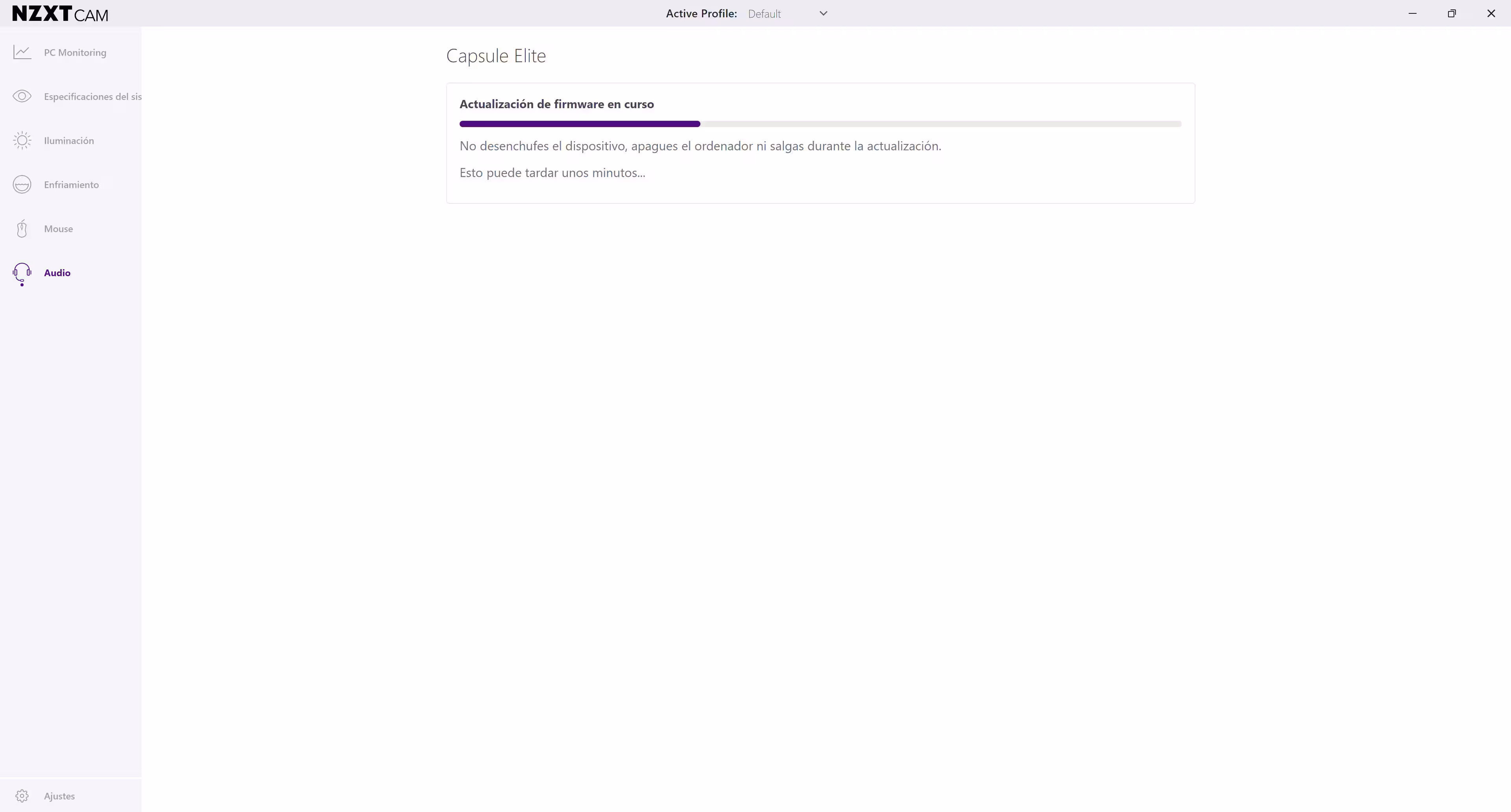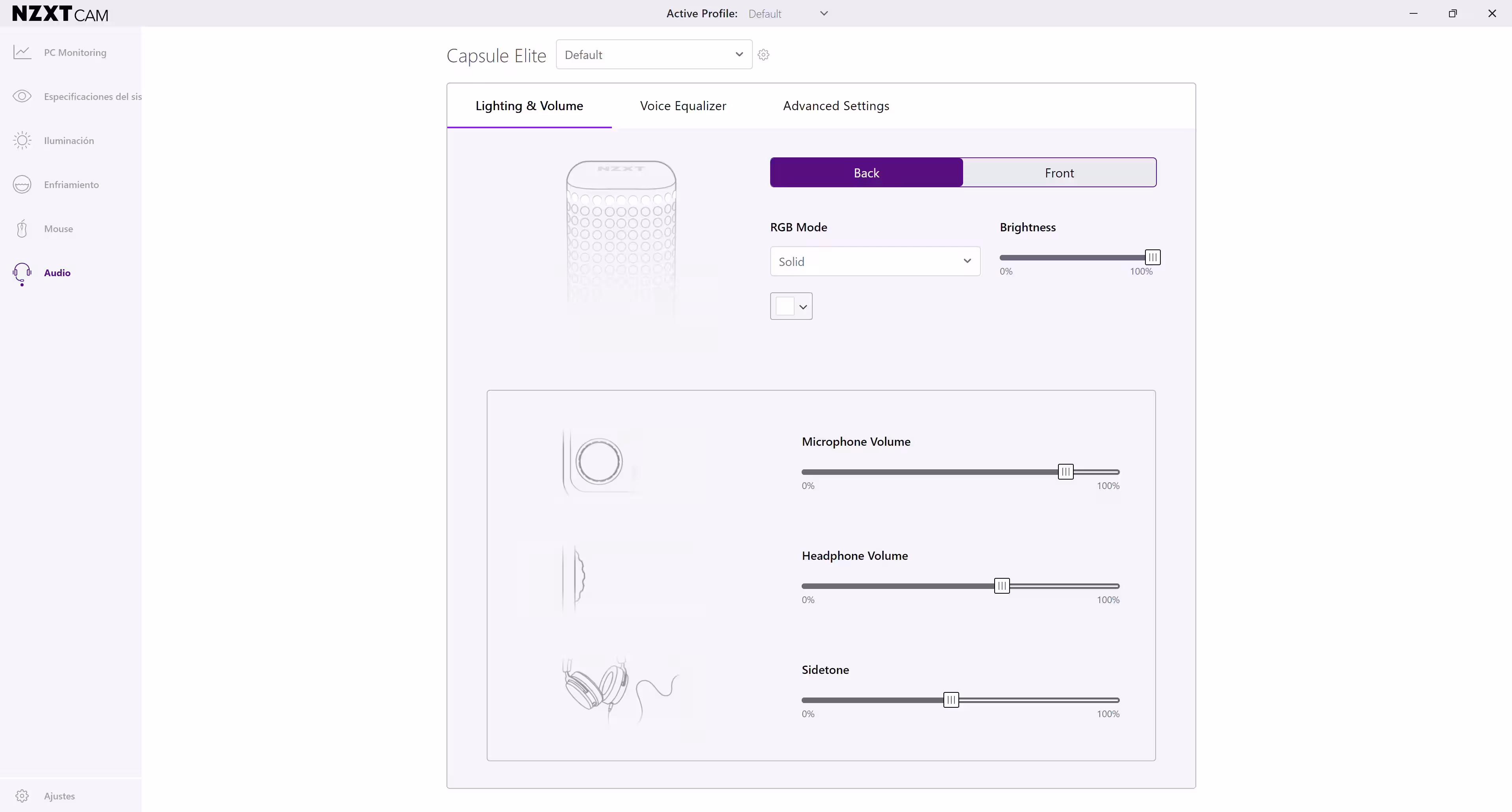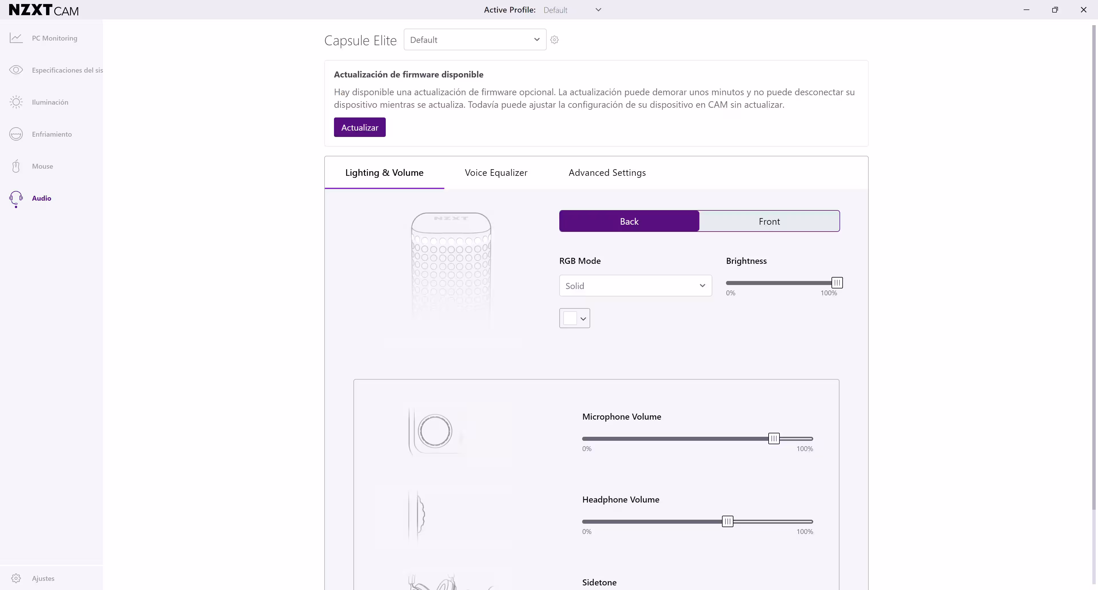 El programa de configuración usado para configurar es CAM, el centro neurálgico de todos los productos de NZXT. Lo primero a hacer es instalar una actualización, la cual se hará en uno o dos minutos. No es obligatoria, por lo que el micrófono se puede empezar a usar inmediatamente. Las primeras cosas a configurar son el brillo de los ledes o el efecto de iluminación ARGB de la parte posterior del micro.
