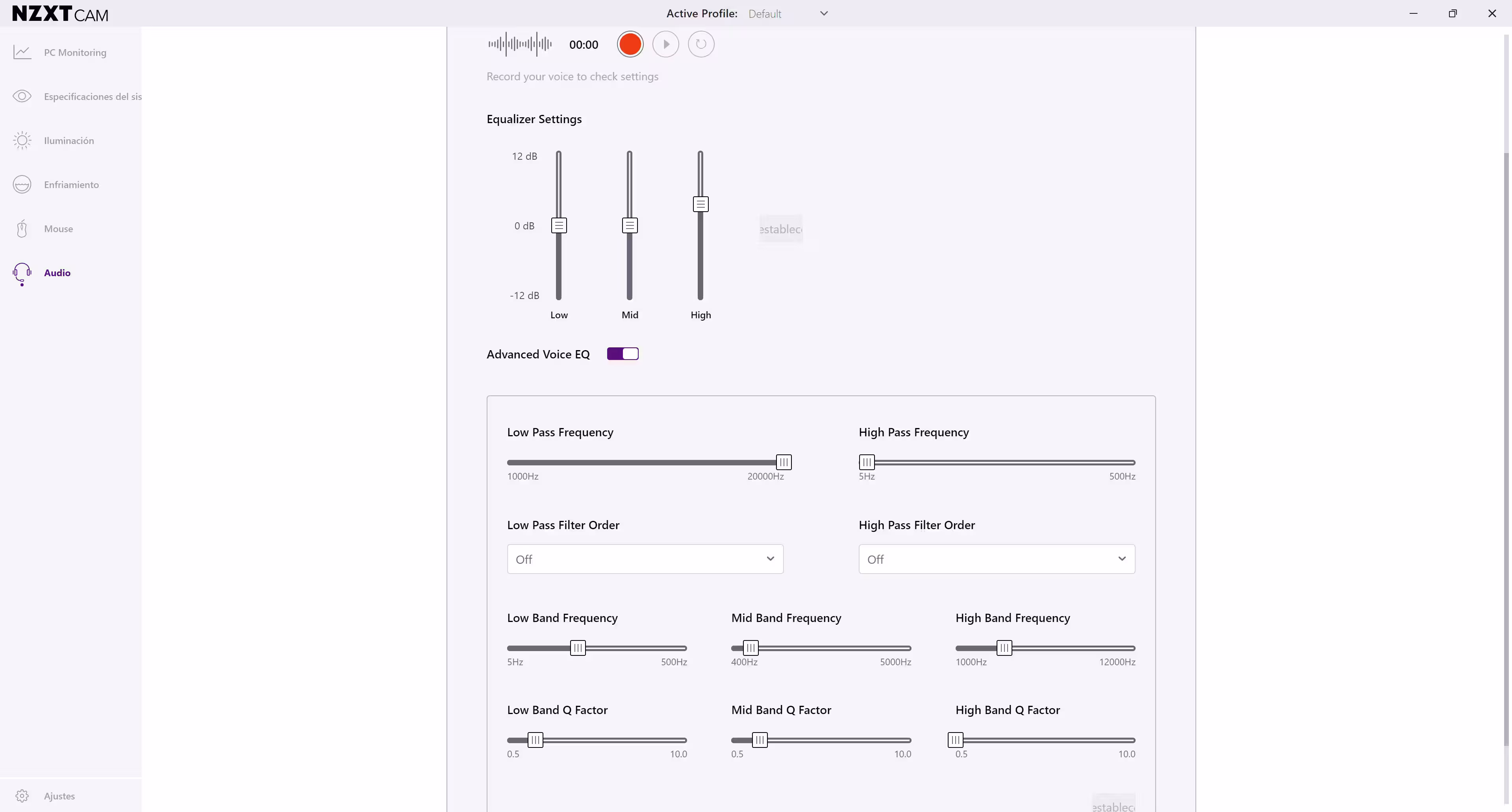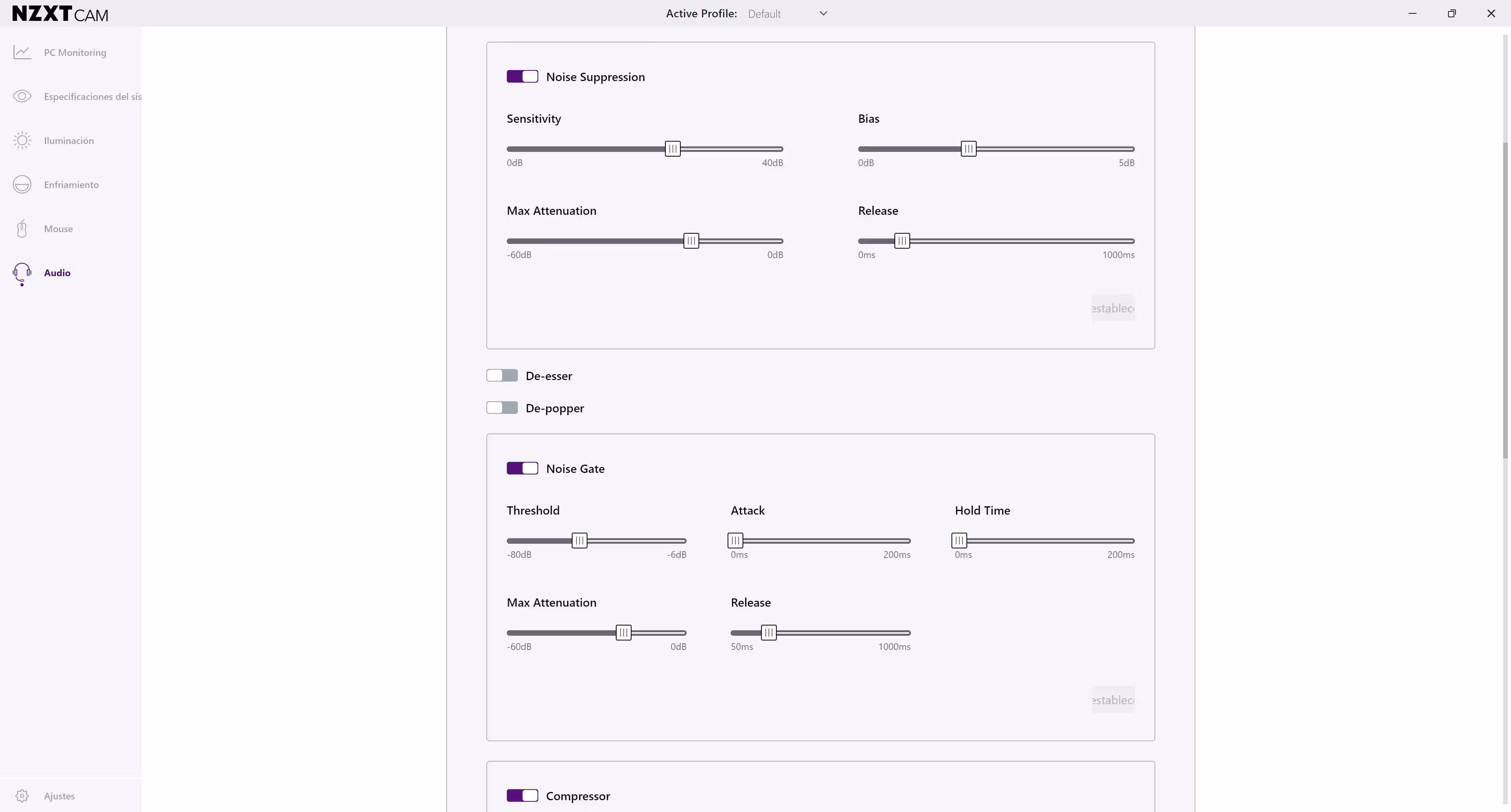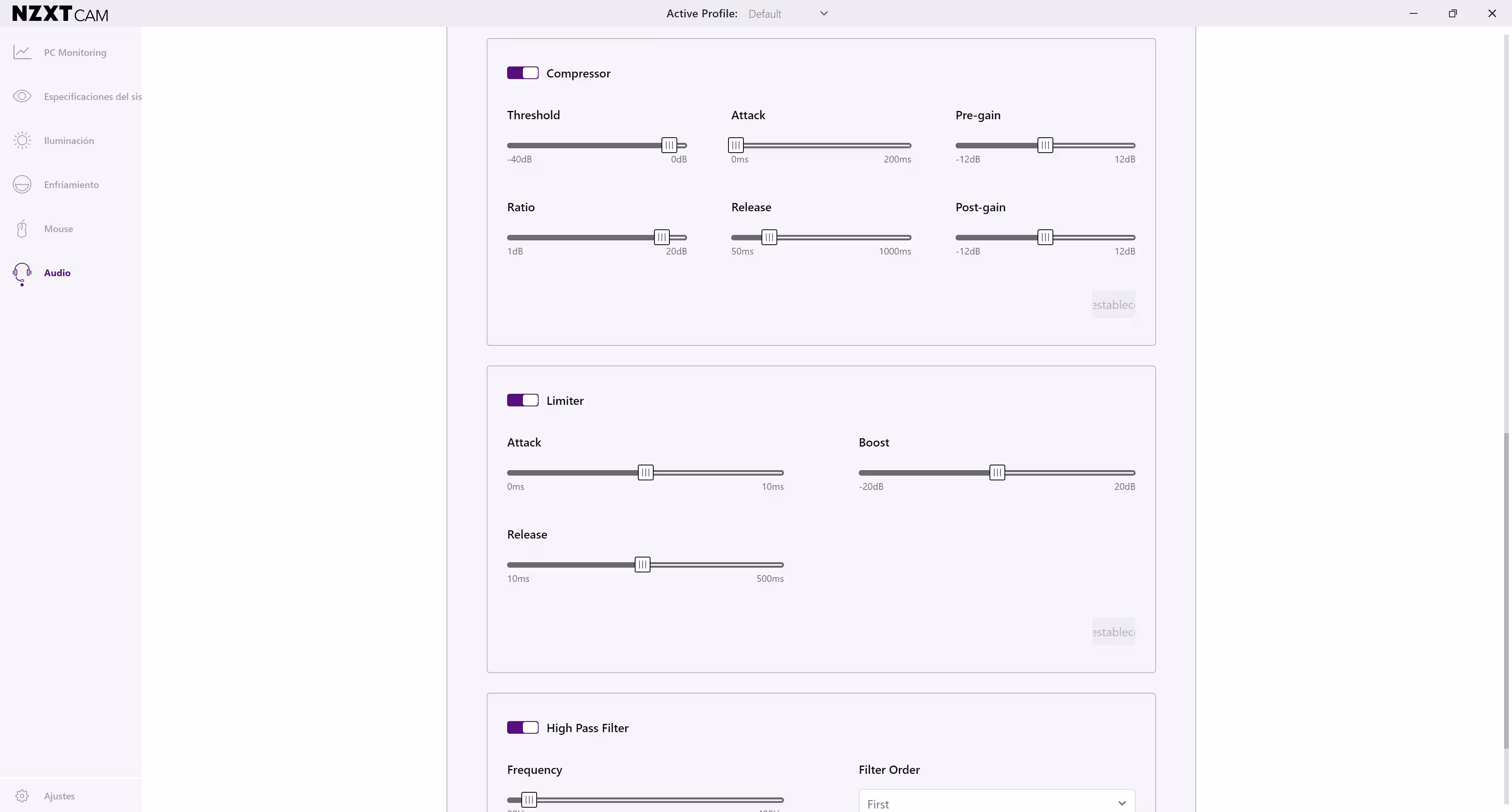 Entre esas opciones están cambiar la frecuencia de las bandas baja, media y alta, o el factor Q. En la última pestsaña hay más ajustes, como la sensibilidad, atenuación máxima, puerta de ruido con el límite, zona de ataque, atenuación máxima, zona de limitación, filtro paso alto, y más. Son parámetros que no se suelen ver en un micrófono por esta zona de precios, y menos uno jugón, por lo que por este lado NZXT ha hecho un buen trabajo.