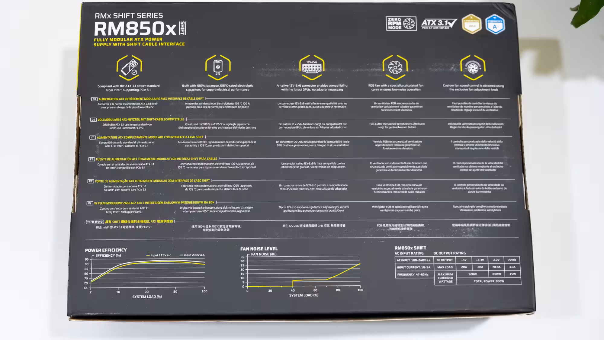 La fuente RM850x Shift 2025 de Corsair llega en la habitual caja amarilla y negra con el diseño que usa para las fuentes de alimentación. La portada incluye la información básica, como los certificados Cybenetics que tiene, que es totalmente modular, y ATX 3.1 con los conectores en el lateral (diseño Shift). En un lateral pone los cables y conectores que aportan, con las curvas de eficiencia y ruido en la parte trasera.