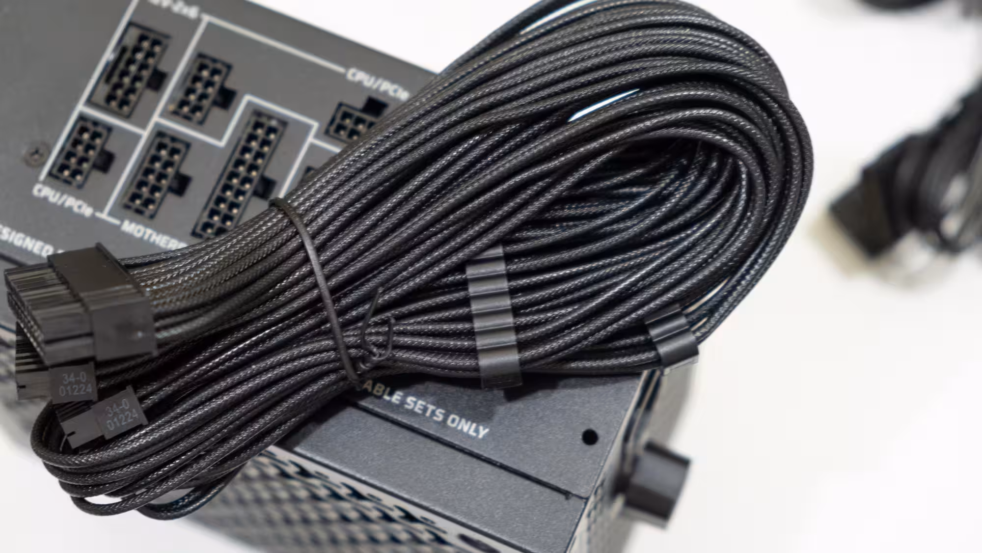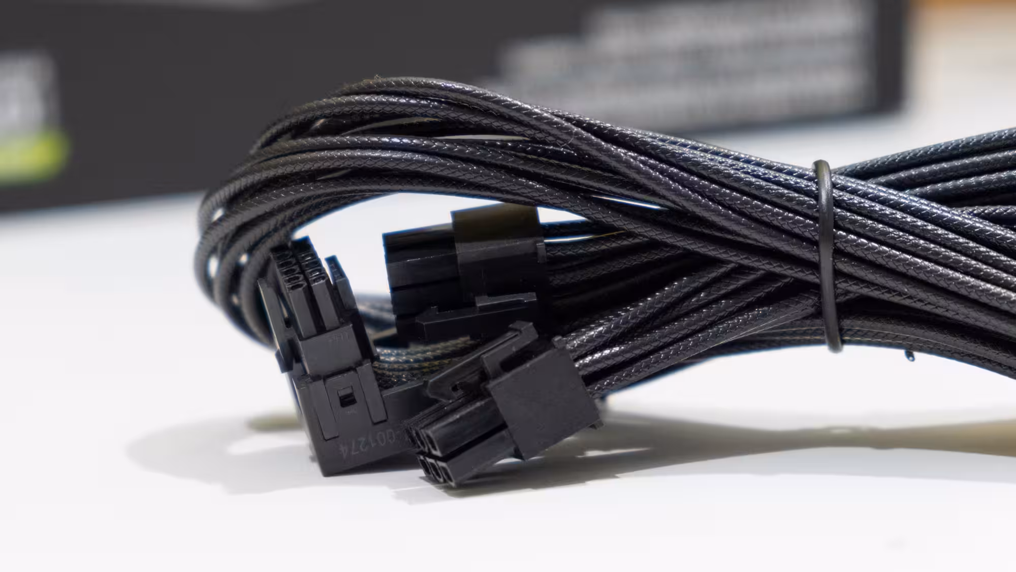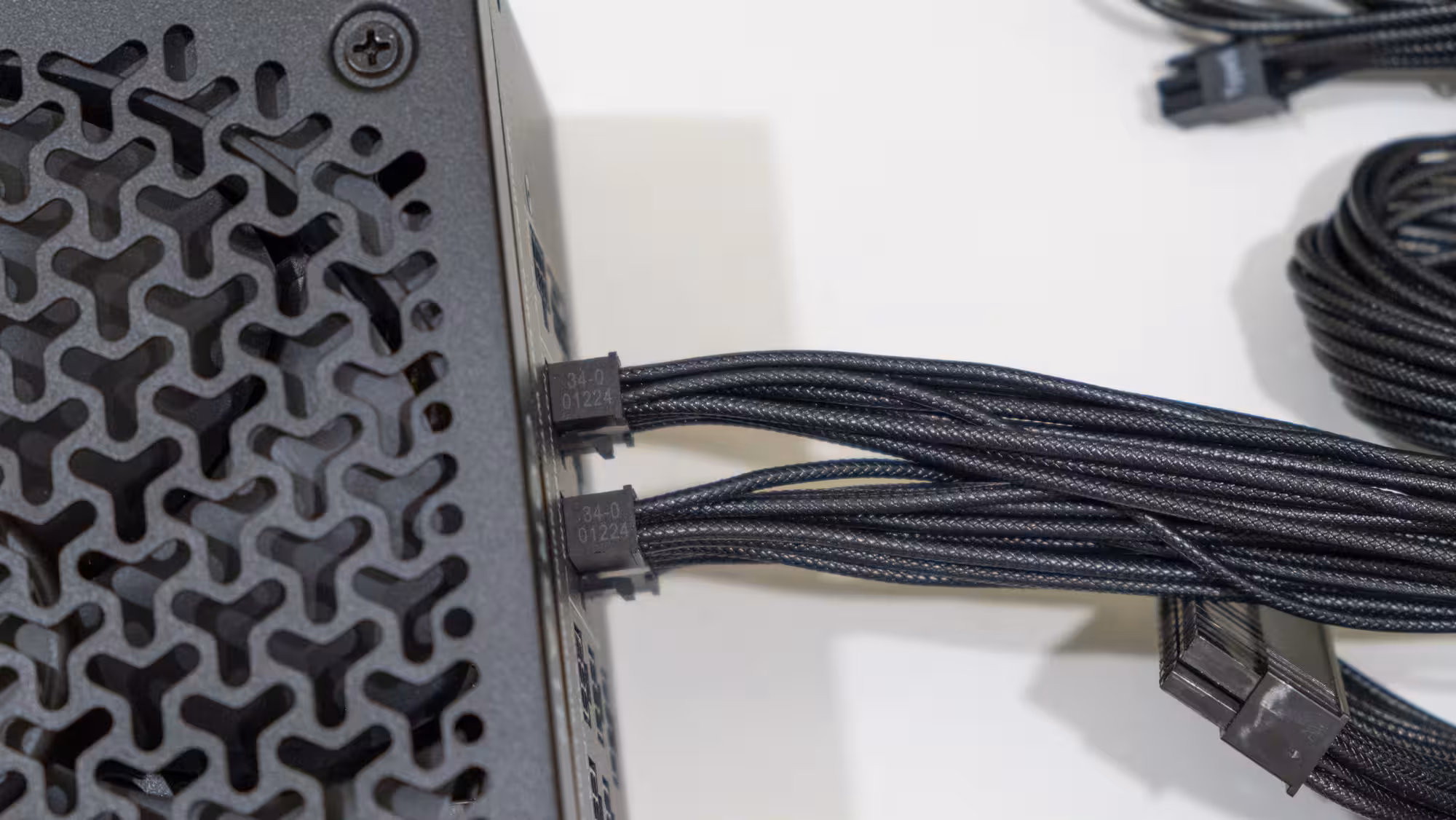 El cambio más significativo en esta ocasión, además de la mejora de los estándares y la reorganización de las tomas, es que ahora incluye un 12V-2x6 en la propia fuente. Corsair incluye dos cables con este conector, y ambos tienen un conector que sale en perpendicular, lo cual es útil. Luego los cables aportan dos PCIe de 6+2 pines o un 12V-2x6 con la punta en color gris claro en lugar de negro para ver que se haya insertado totalmente en la tarjeta gráfica.