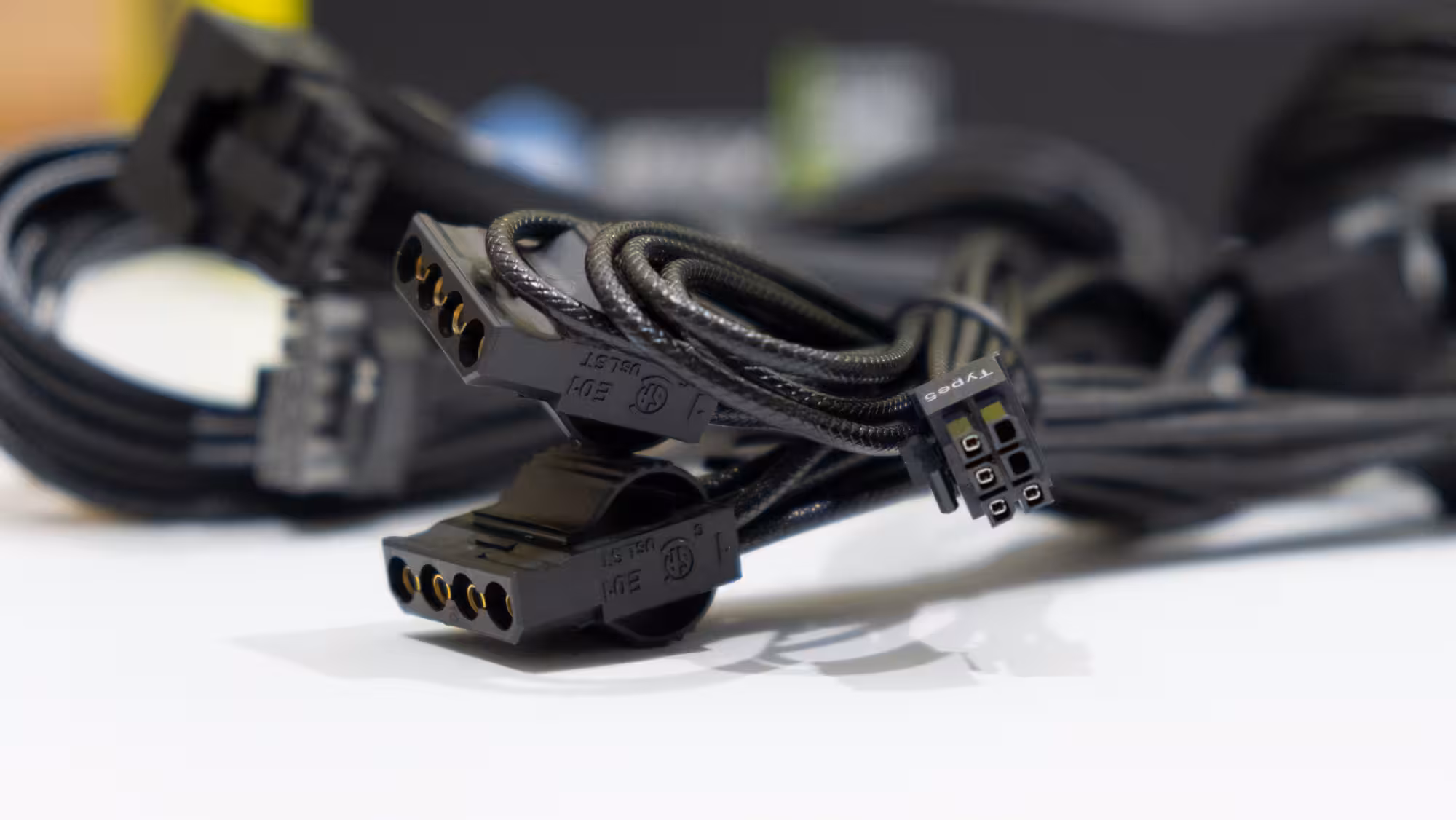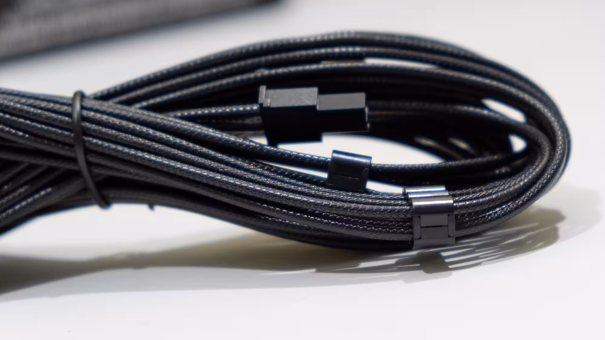 Como fuente modular integra los conectores de tipo Micro-Fit tipo 5 de Corsair, que son similares a los estandarizados por Molex pero algunos no tienen el mismo patillaje. Sobre todo ocupan menos que los de tipo 4 que se usan en las fuentes de alimentación normales, o al menos los que usa Corsair en muchas fuentes. Los cables incluidos con la fuente se componen a su vez de varios cables separados, y en algunos casos con una pieza para que estén juntos, como en los PCIe o ATX. Son de buena calidad, pero no a todo el mundo gustará que los cables estén sueltos.