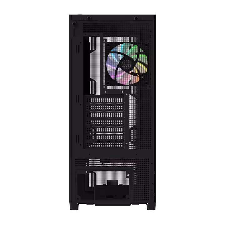 Mirando a las posiciones de ventilación, hay espacio en el frontal para tres ventiladores de 120 mm o 140 mm, otros tres de 120/140 mm en la parte superior, otros tres de 120 mm en el aparte inferior sobre la cubierta del compartimento de la fuente de alimentación, y uno más de 120 mm en la parte trasera.