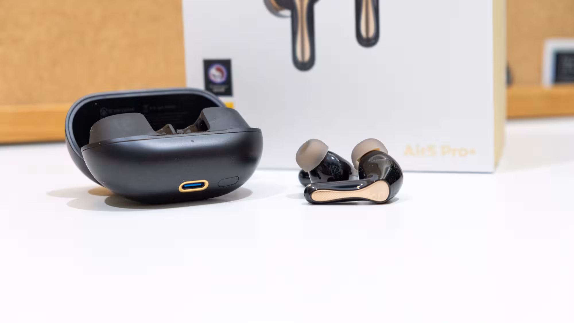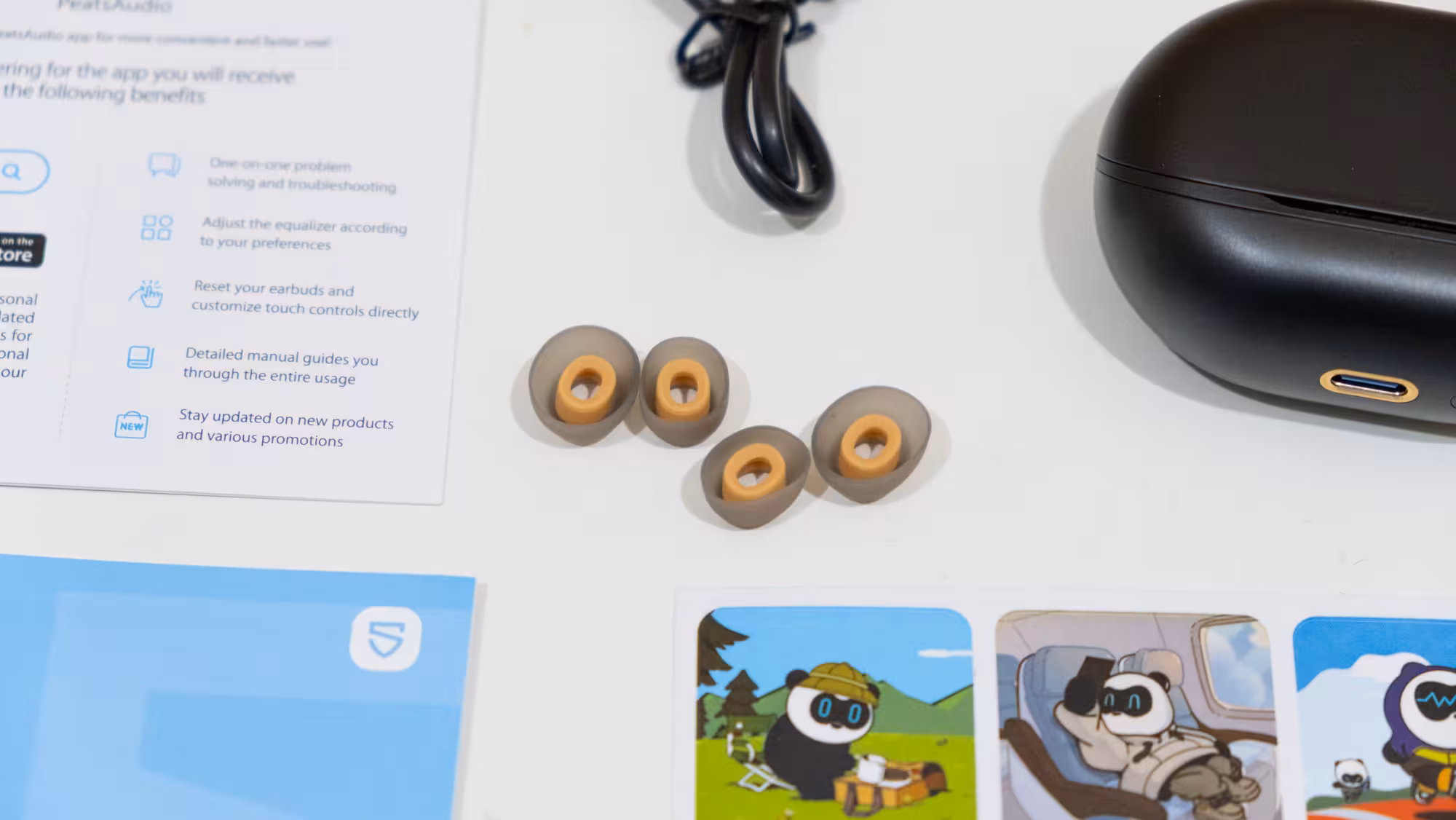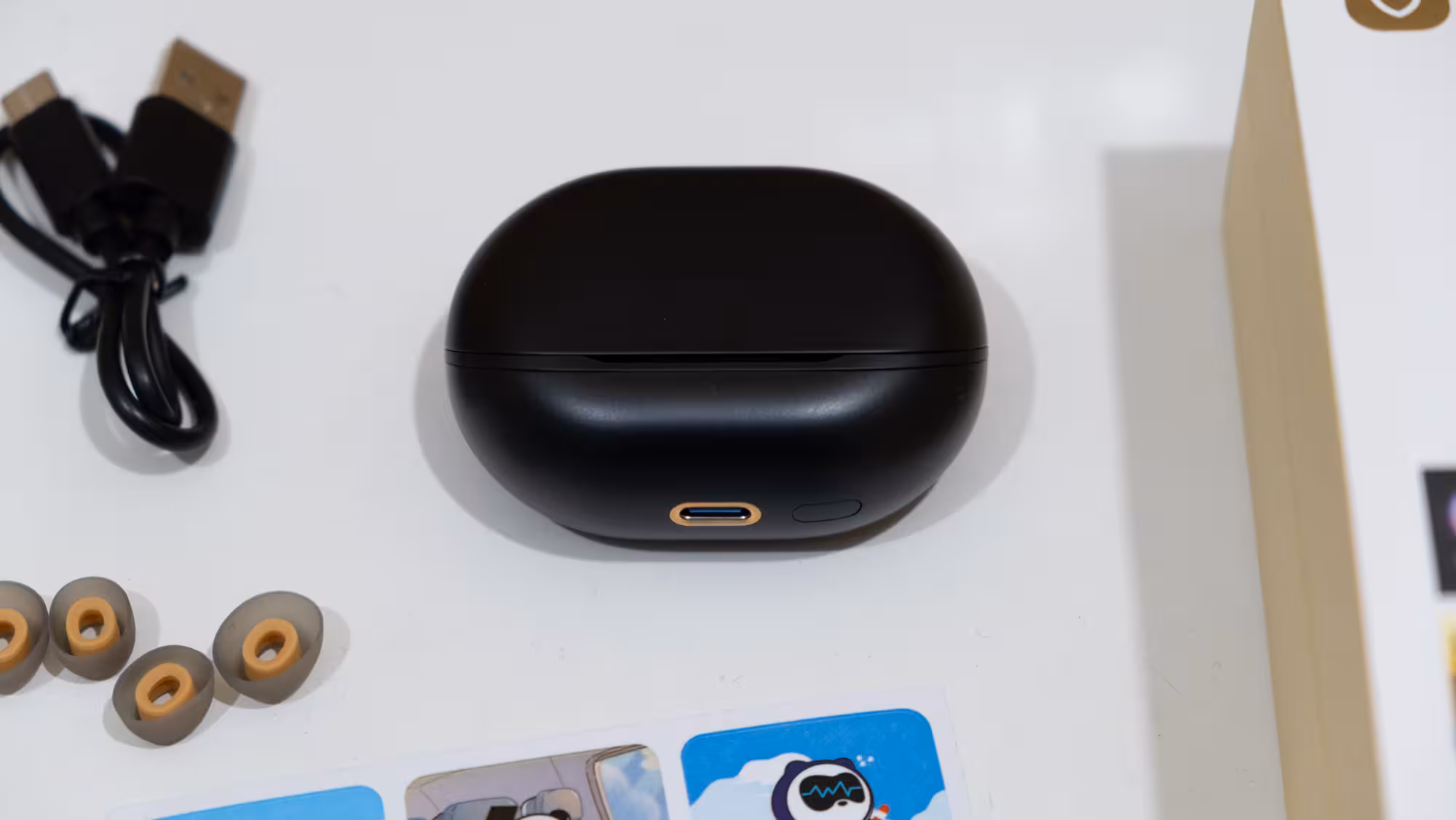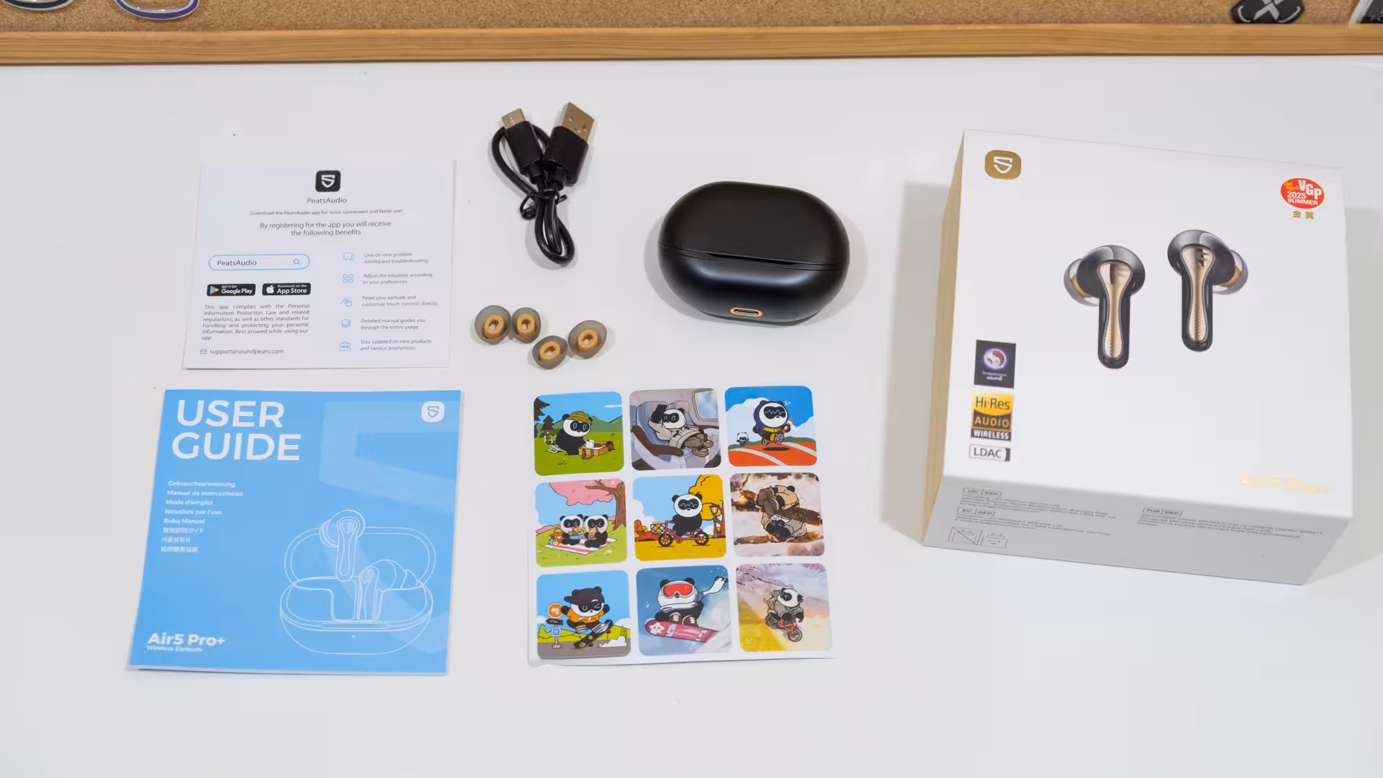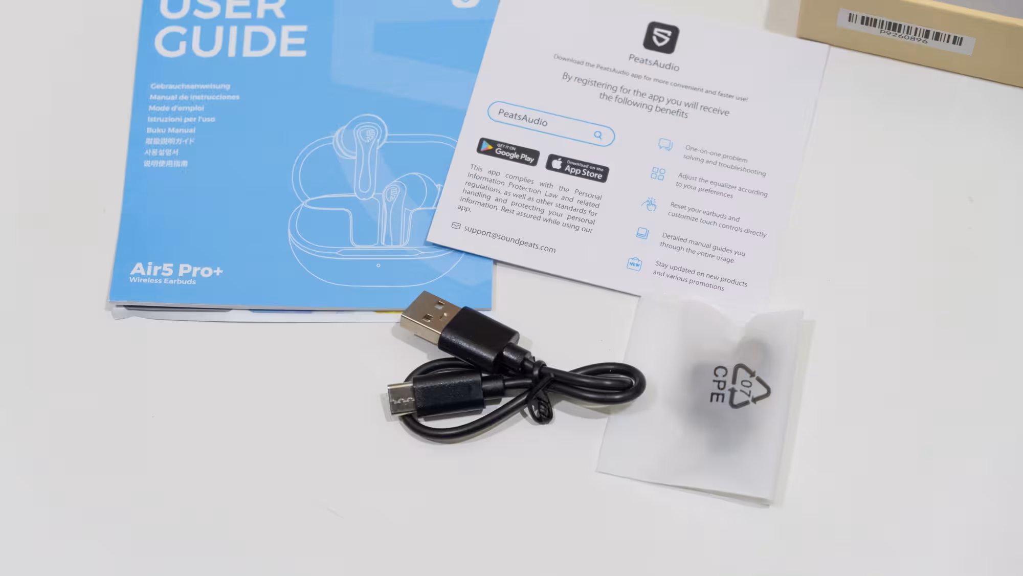 Los Air 5 Pro+ de SoundPEATS llegan en una pequeña caja amarilla con sobrecubierta blanca con una mínima información técnica en la parte trasera. Al abrirla se ve una carpeta con documentos con información variada como un manual de usuario, una nota para que se descarga el programa de configuración y unas pegatinas. Debajo está el estuche de los auriculares protegido por una lámina de plástico, y a su vez debajo hay un cable corto USB tipo C a USB tipo A y un par de juegos adicionales de puntas de silicona para ajustarlos mejor para la ANC.