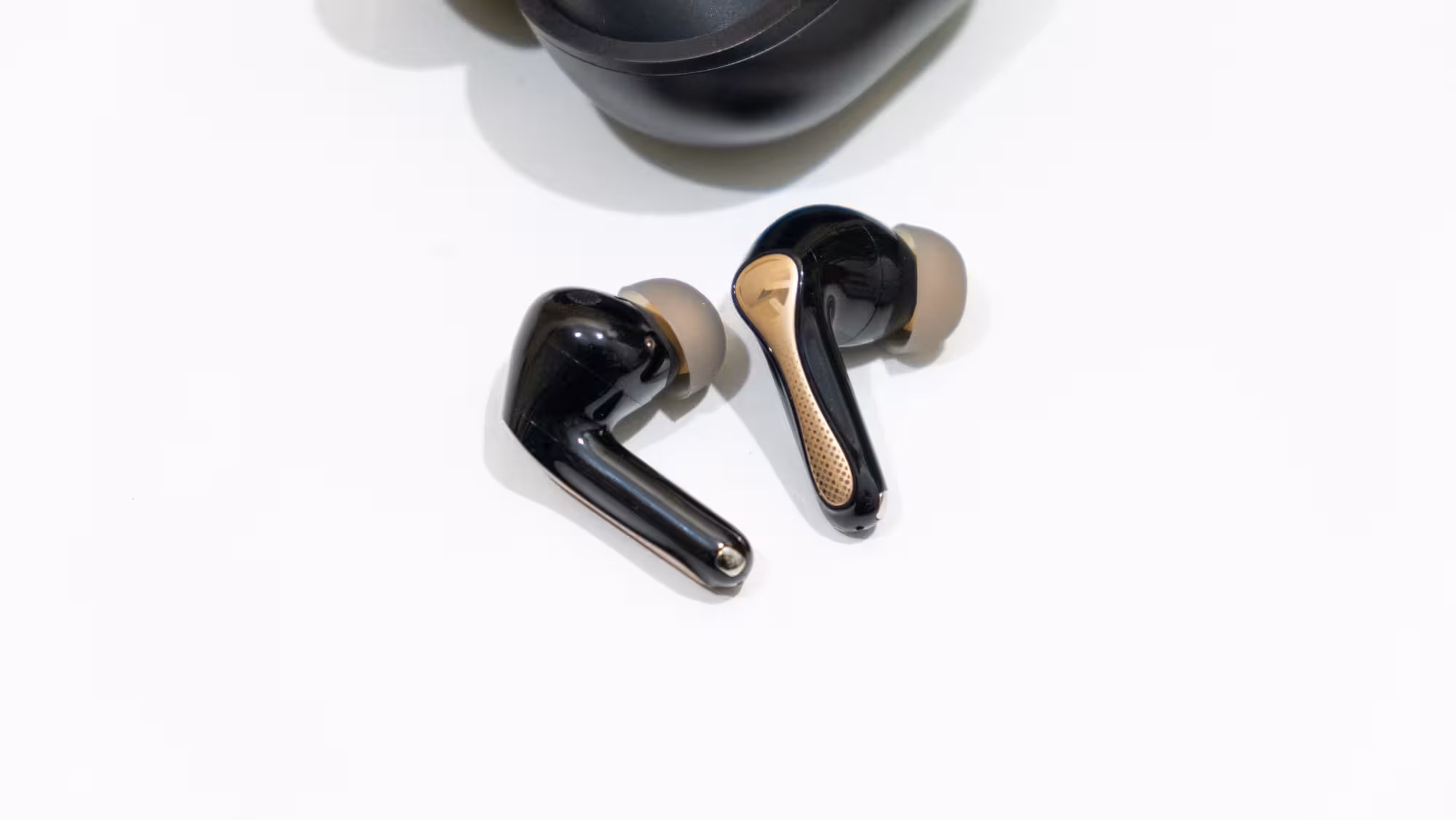 En el estuche de los auriculares se pueden ver los dos pinganillos de un diseño habitual para los que tienen ANC, con un cuerpo en forma de bola y un mástil en el que tiene los dos contactos para su recarga en la caja. La superficie exterior tiene un acabado liso en color negro y una franja en dorado con el logo de SoundPEATS en un extremo. En general, son bonitos. Pueden estar en contacto con agua (IPX5), mayormente sudor, pero no permiten su inmersión.