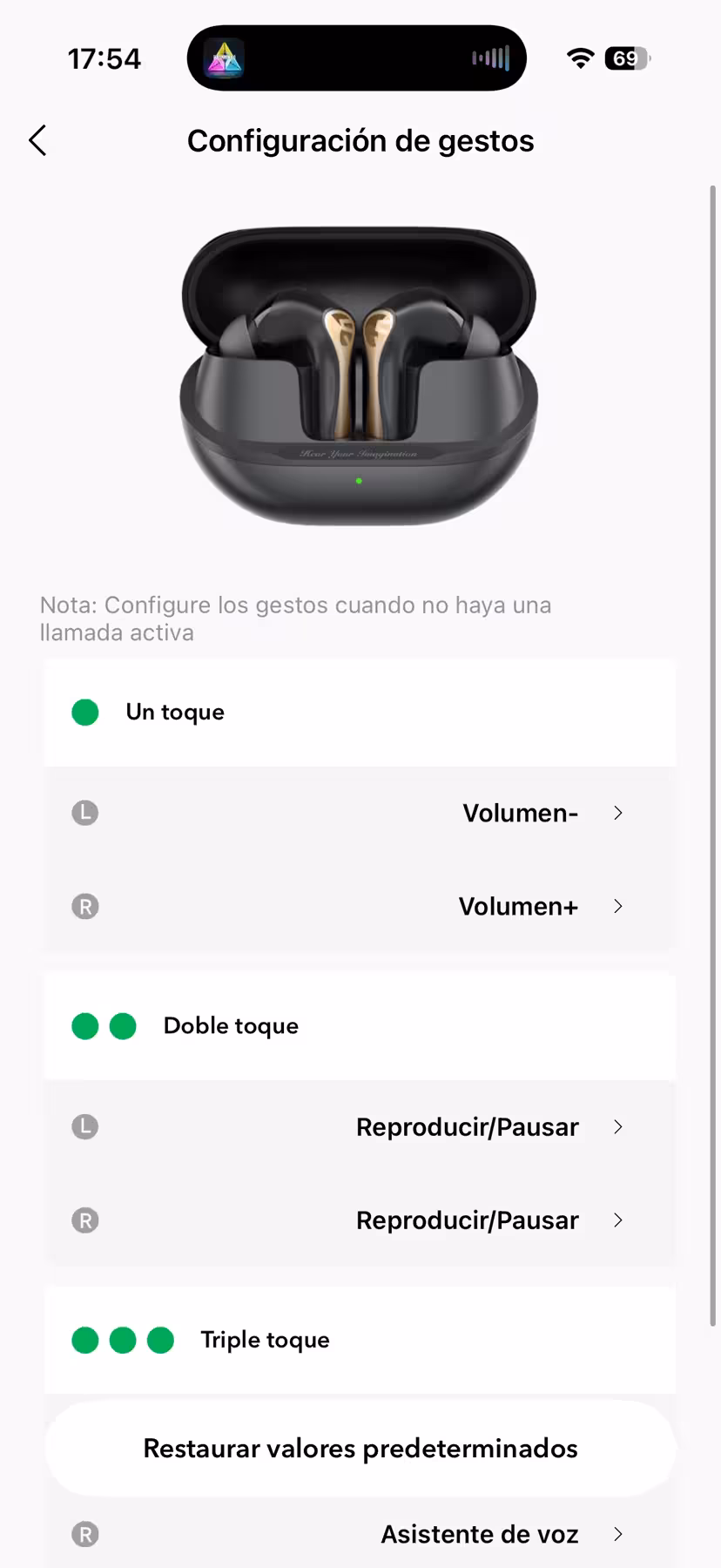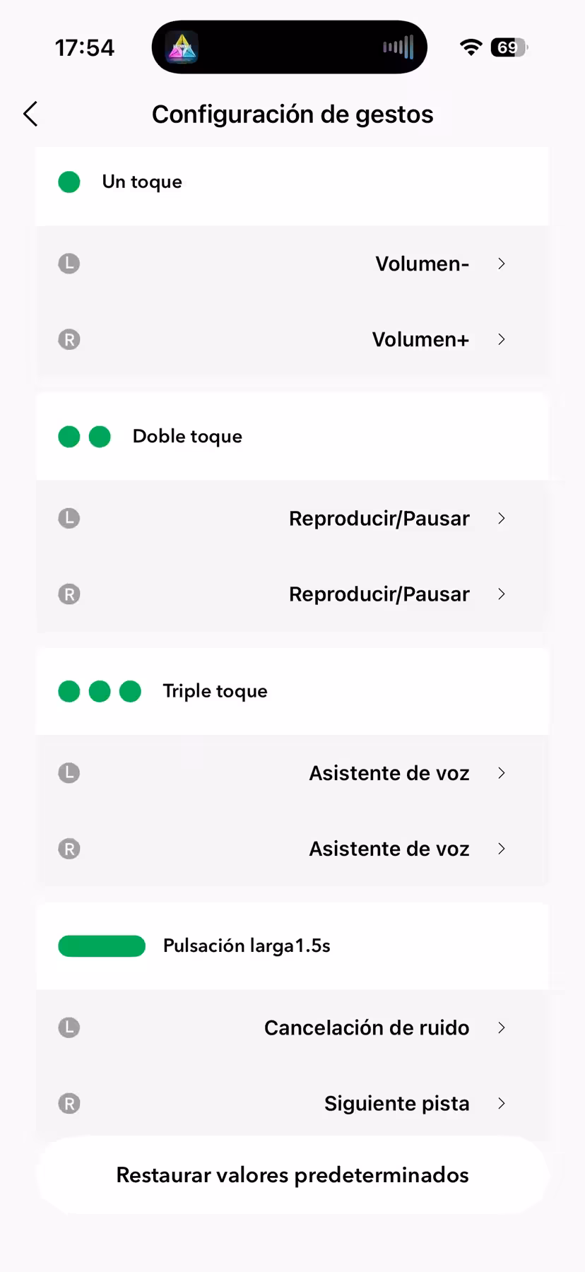 La otra característica importante para la que sirve la aplicación es para configurar los gestos táctiles en la superficie de los pinganillos. Como he dicho antes, hay que acostumbrarse a la forma de realizar los toques sobre su superficie, y algunos como el triple toque son un poco más erráticos. Pero las opciones para los gestos son las que son y no hay ningún otro que no esté ya asignado.