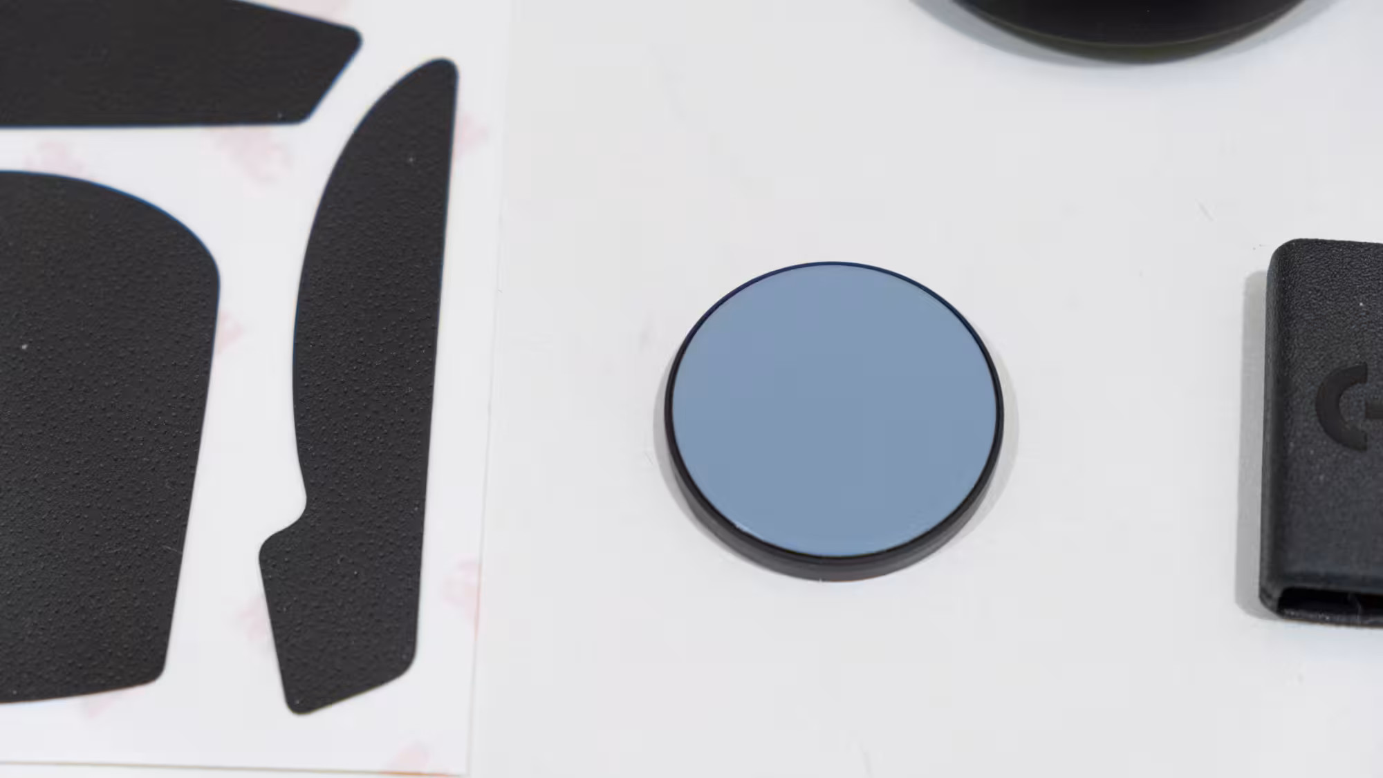 Si se mira la parte inferior se puede ver el sensor, uno óptico de Logitech, así como una amplísima almohadilla de teflón puro en la parte superior y otra en torno al disco de tapa o Powerplay 2, según lo que se ponga. Debido a lo poco que pesa el ratón y la gran superficie que cubre sus almohadilla.