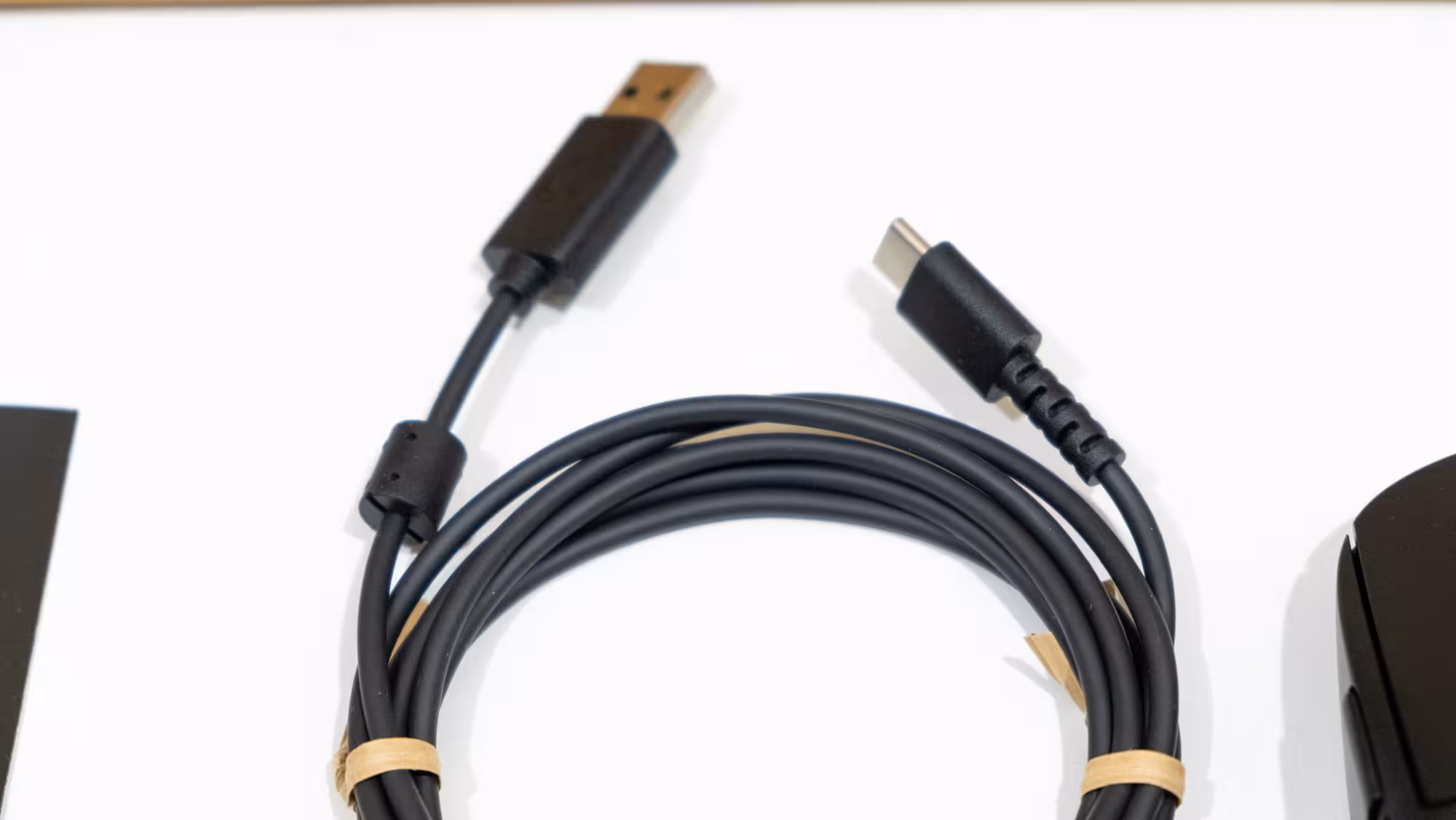 Debajo de esta bandeja se puede ver una un adaptador USB-C a USB-A para un cable USB-C en el que está puesto el receptor USB. Este último se puede guardar en el interior del ratón si se quiere transportar. También se puede ver una caja con el cable de conexión y recarga, con un USB tipo C en un extremo y un USB tipo A en el otro, así como una guía de conformación legal, una guía de inicio rápido, una tapa con teflón de la que hablaré más abajo, y unas gomas para mejorar el agarre. El cable tiene una envoltura de plástico, siendo fino y flexible para no entorpecer su uso cableado.