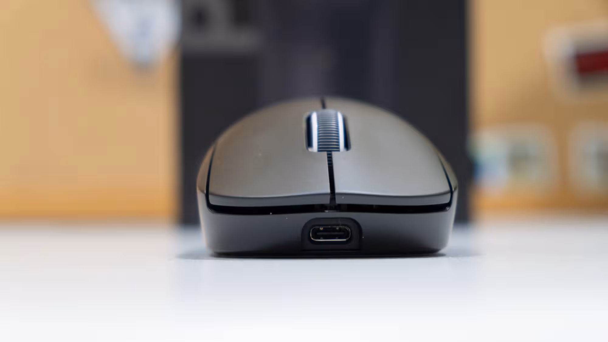 En la parte superior se puede ver la ruedecilla, la cual tiene un deslizamiento bastante suave pero con el punto justo de respuesta táctil como para que se note bien cómo va deslizando. En el reposapalma está el logo de Logitech G. En el lateral izquierdo se encuentran dos botones adicionales, que junto a los principales y el clic central de la ruedecilla son todos los botones de que dispone, así que echo en falta alguno más para que lo usara en el día a día. En el frontal tiene la toma USB tipo C, que en general debería entrar cualquier cabezal USB tipo C por ancho que sea.