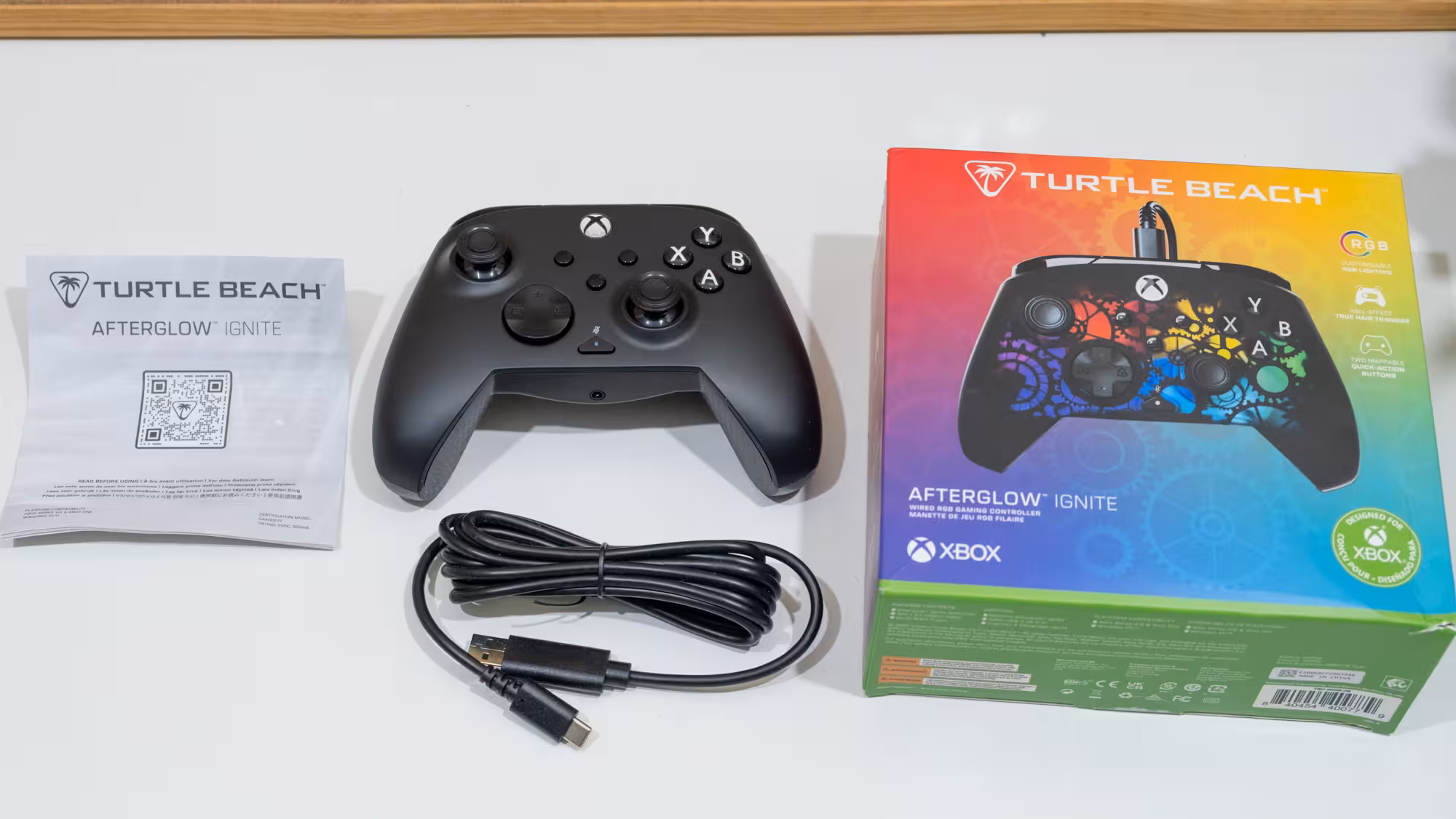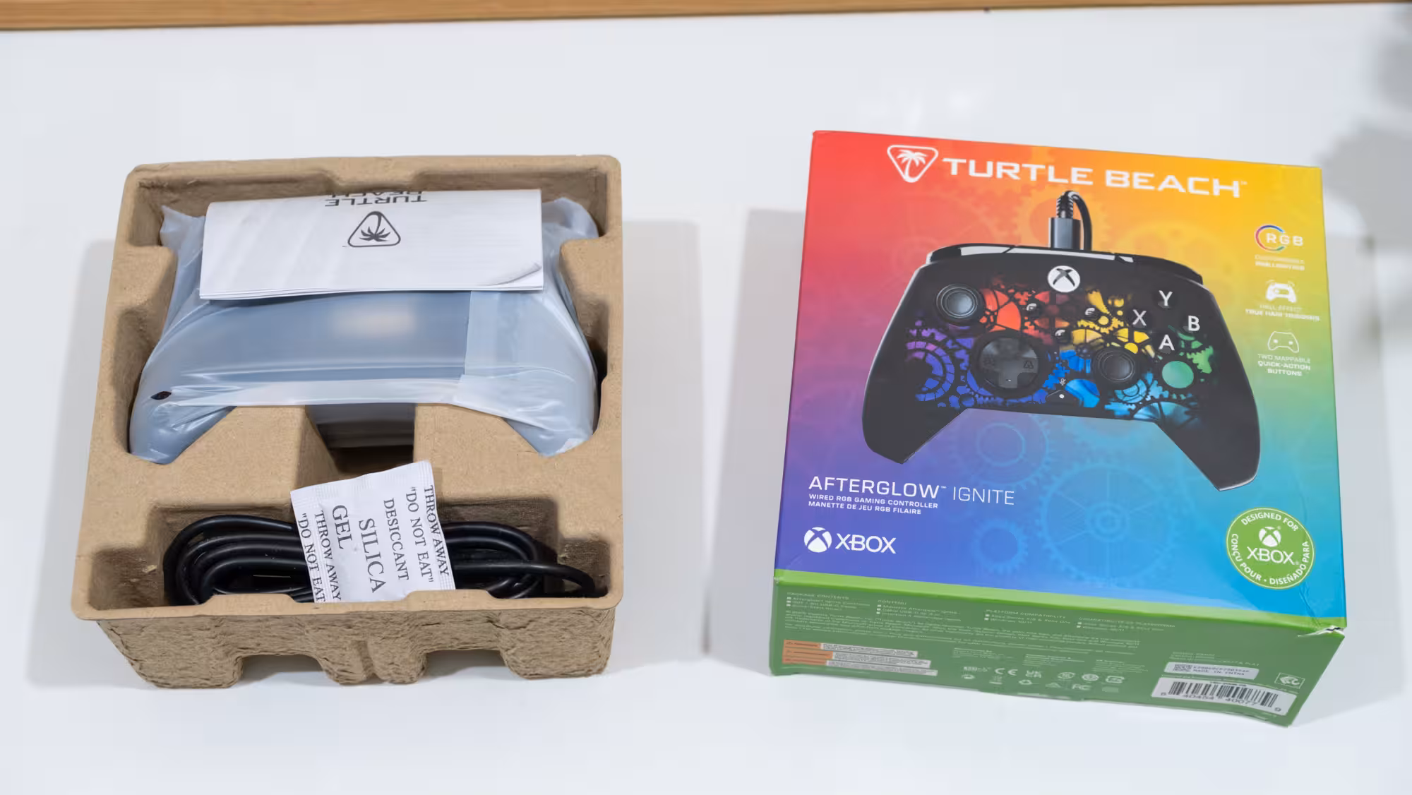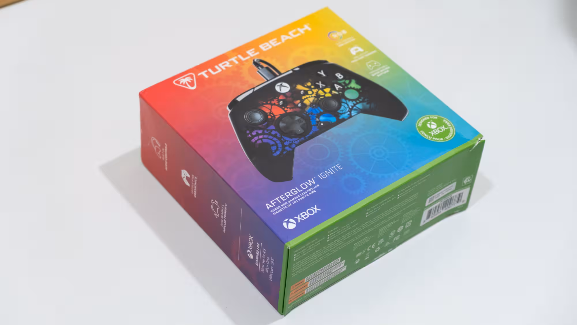 El Afterglow Ignite de Turtle Beach llega en una caja de portada multicolor, pero dejando claro que es un producto oficial de Xbox. Así que además de funcionar perfectamente con esta consola, también funciona en PC, aunque en macOS no he conseguido hacerlo funcionar. Es un modelo de diseño xboxero estándar y de conexión por cable, que muchos lo prefieren frente a los inalámbricos, a la vez que los cableados son más baratos a mismas prestaciones.