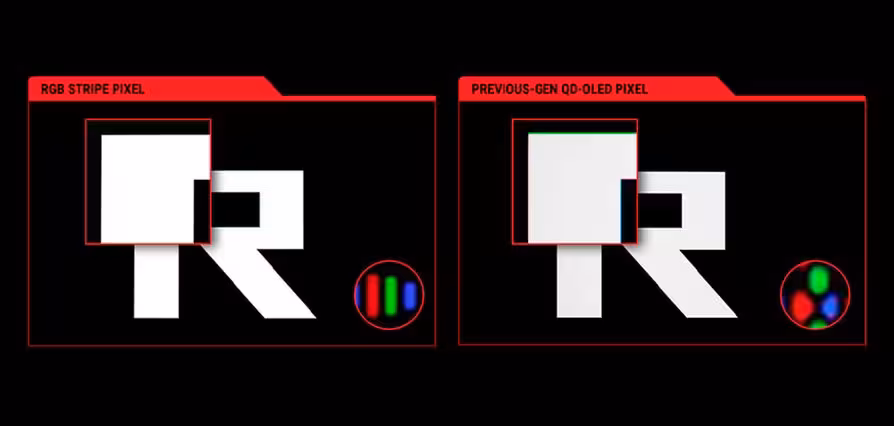 Sea como sea, los nuevos monitores usan estos paneles de «franjas RGB», que recibe el nombre porque los subpíxeles están dispuestos en franjas, siendo de distintas longitudes. La disposición de los subpíxeles RGB ha dado para mil y un tipo de paneles, que en los OLED no terminan de acertar con ello por incluir además la iluminación a nivel de píxel. Estos paneles también mejoran la percepción del color negro cuando no es negro puro (todos los subpíxeles desactivados) con una tecnología llamada BlackShield.