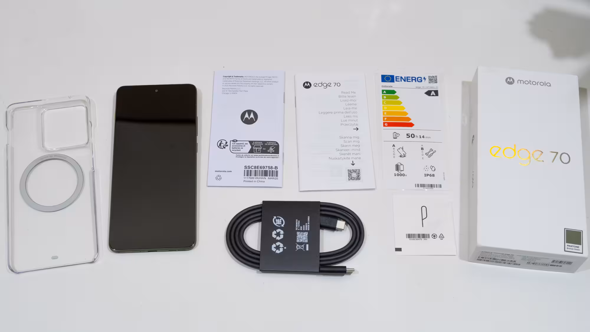 El Edge 70 llega en una blanca simple, con poca información del producto. Al abrirla se ve una carpeta de cartón en la que se se encuentra una funda de plástico transparente, un alfiler de apertura, manuales, información de conformación legal, y un cable USB-A a USB-C. Debajo se encuentra el móvil. Como es ya costumbre por las leyes eurounionistas, no se incluye cargador.