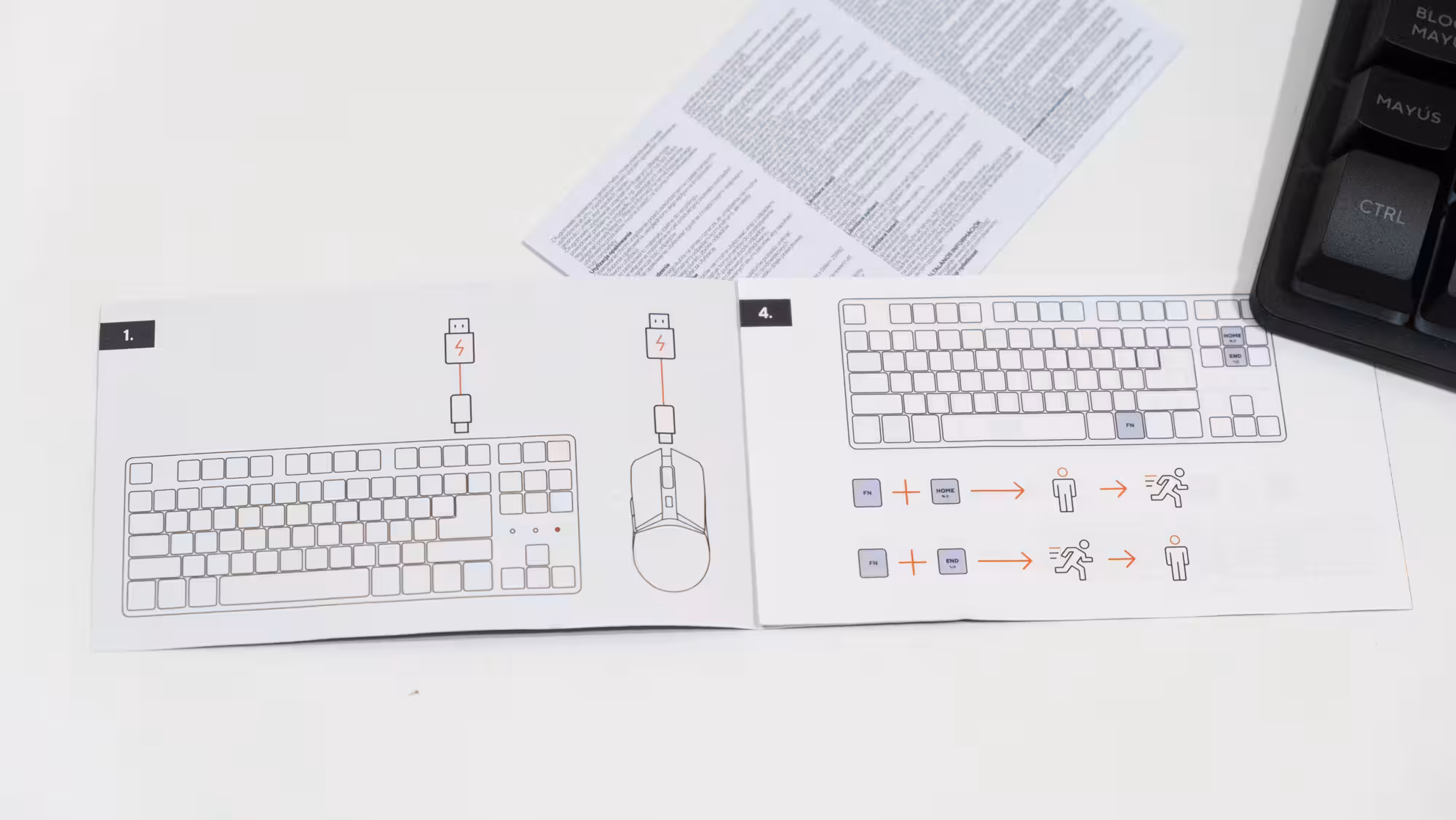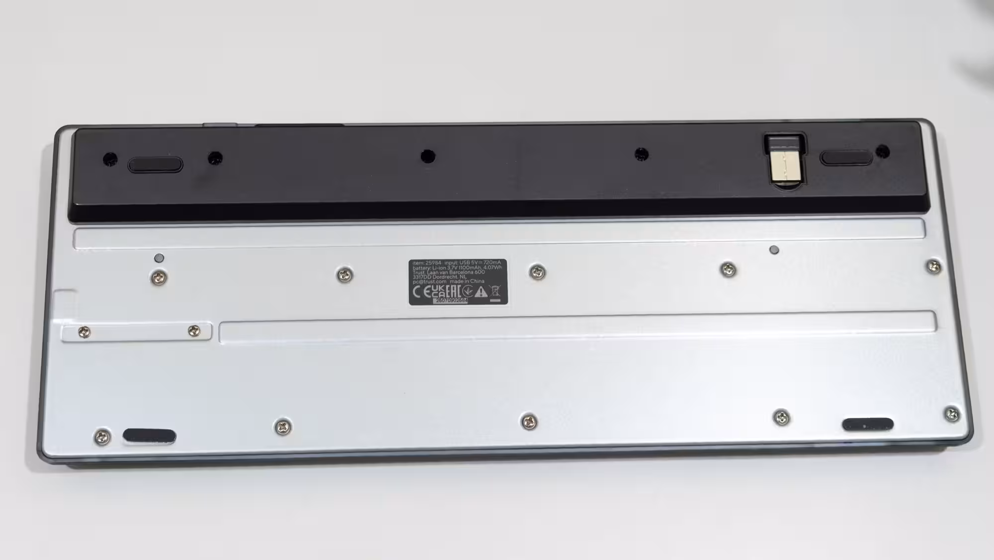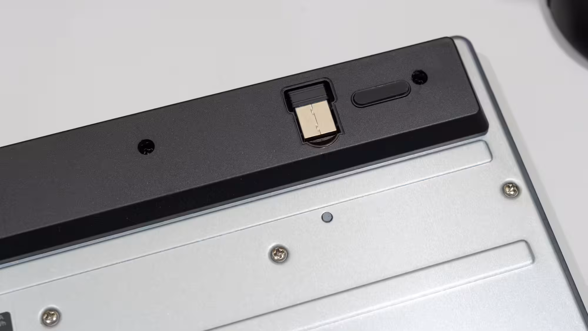 En la parte derecha están los ledes de bloqueo mayúsculas, bloqueo desplazamiento y cursores. En la parte inferior hay una plancha metálica con un único pie de algo más de un centímetro para alzarlo. La altura es adecuada para usarlo sin reposamuñecas. Tanto el teclado como el ratón se conectan inalámbricamente a un receptor USB que se guarda en la parte inferior del teclado.