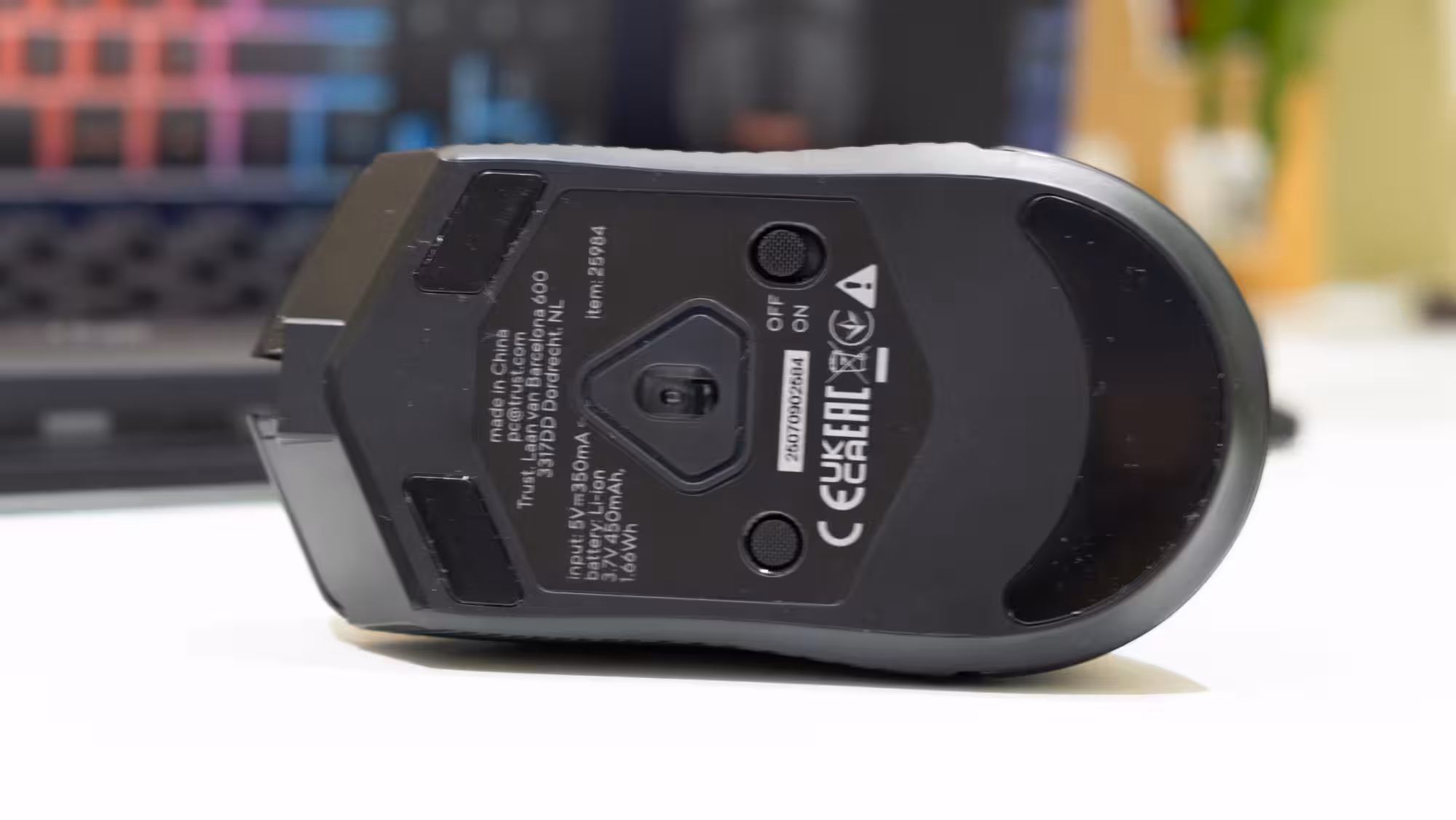 Cuenta en el frontal con una toma USB tipo C para recargarlo. En la parte inferior tiene un interruptor para encederlo y apagarlo, así como un botón para cambiar la iluminación del logo del reposapalma con el que también se puede dejar apagada.