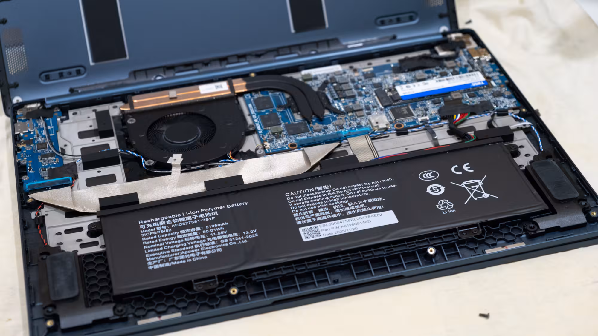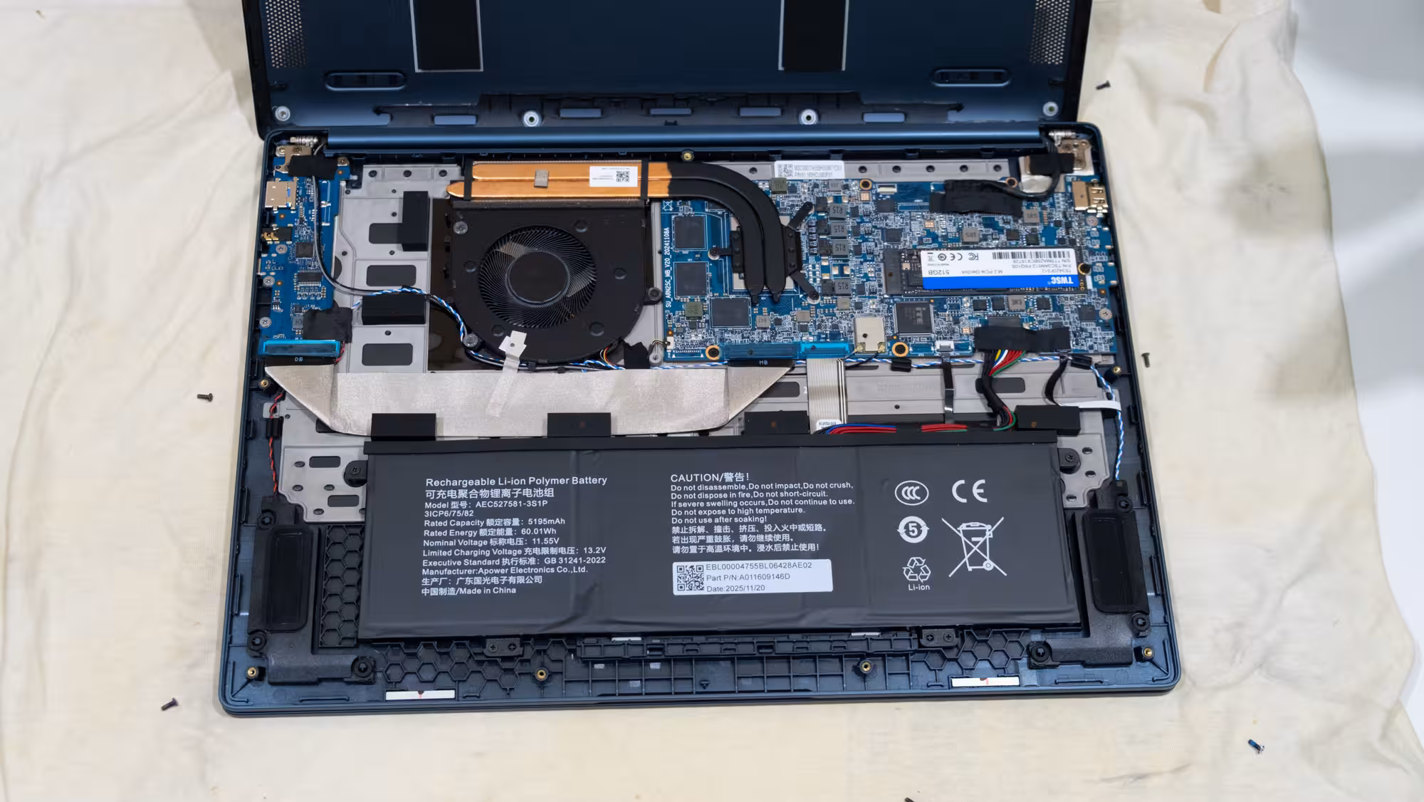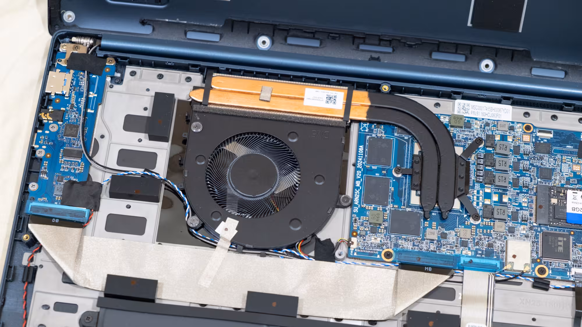 Se puede acceder al interior del equipo quitando unos tornillos en la tapa inferior de aluminio, los cuales requieren destornillador Philips normal. Una vez quitados, la tapa sale muy fácilmente. El sistema de refrigeración está compuesto de dos caloductos de cobre y un solo ventilador de perfil bajo, con un pequeño disipador en la zona de expulsión del aire. Se puede ver que la PCB está compactada, yendo a lo mínimo, y estando dividida en dos partes. También se puede ver la LPDDR5X soldada a la placa base y la ranura M.2 2280 con una SSD de 512 GB de tipo PCIe 3.0.