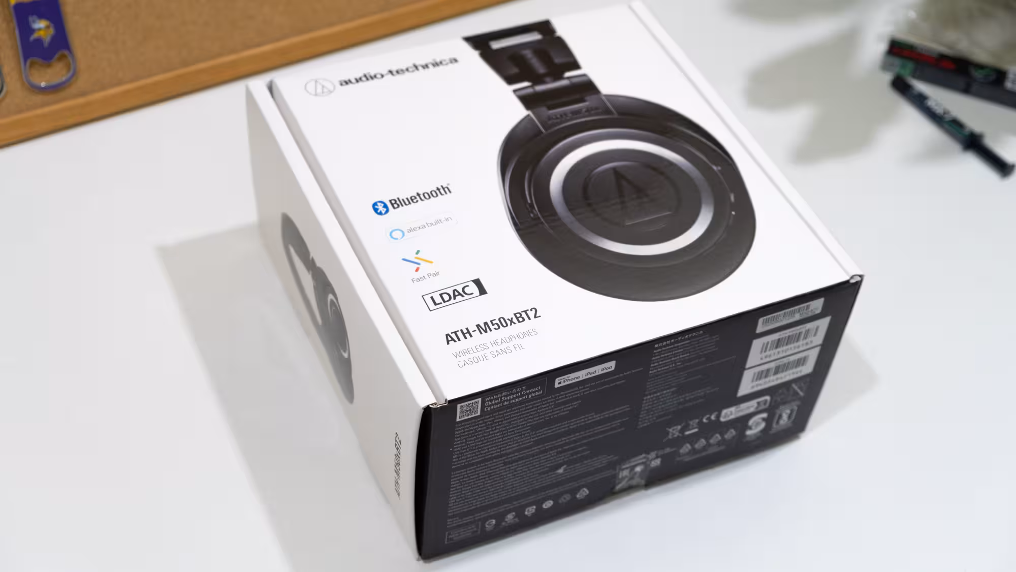 Los auriculares ATH-M50xBT2 de Audio-Tecnica llegan en una caja blanca y negra recalcando que se trata de un modelo Bluetooth, compatible con el emparejamiento rápido de Android, y que puede reproducir usando el códec LDAC. Al abrir los auriculares se puede ver que reposan en una bandeja de cartón reciclado, junto a una bolsa de transporte.