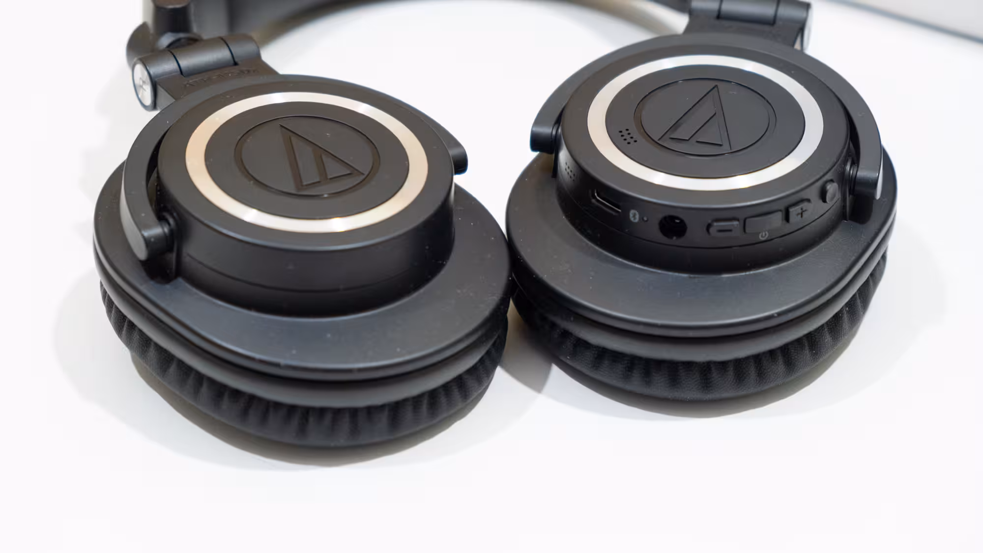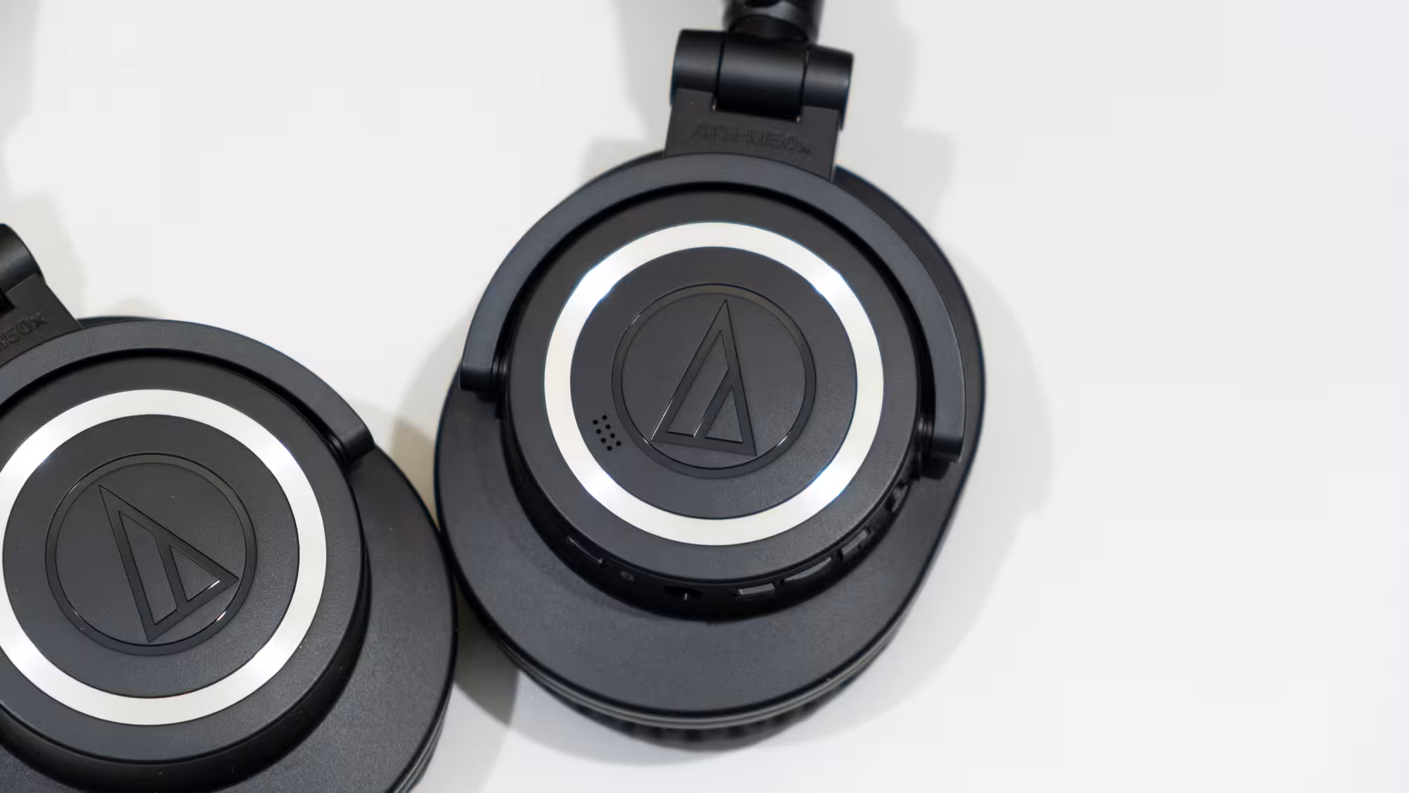 Las copas tienen inscritas el logo de Audio-Technica de manera bastante discreta. La copa izquierda es donde están los controles y tomas, lo cual incluye una toma USB tipo C para la recarga, una de audio de 3.5 mm de tres polos, y los botones de control de volumen y el botón de encendido.