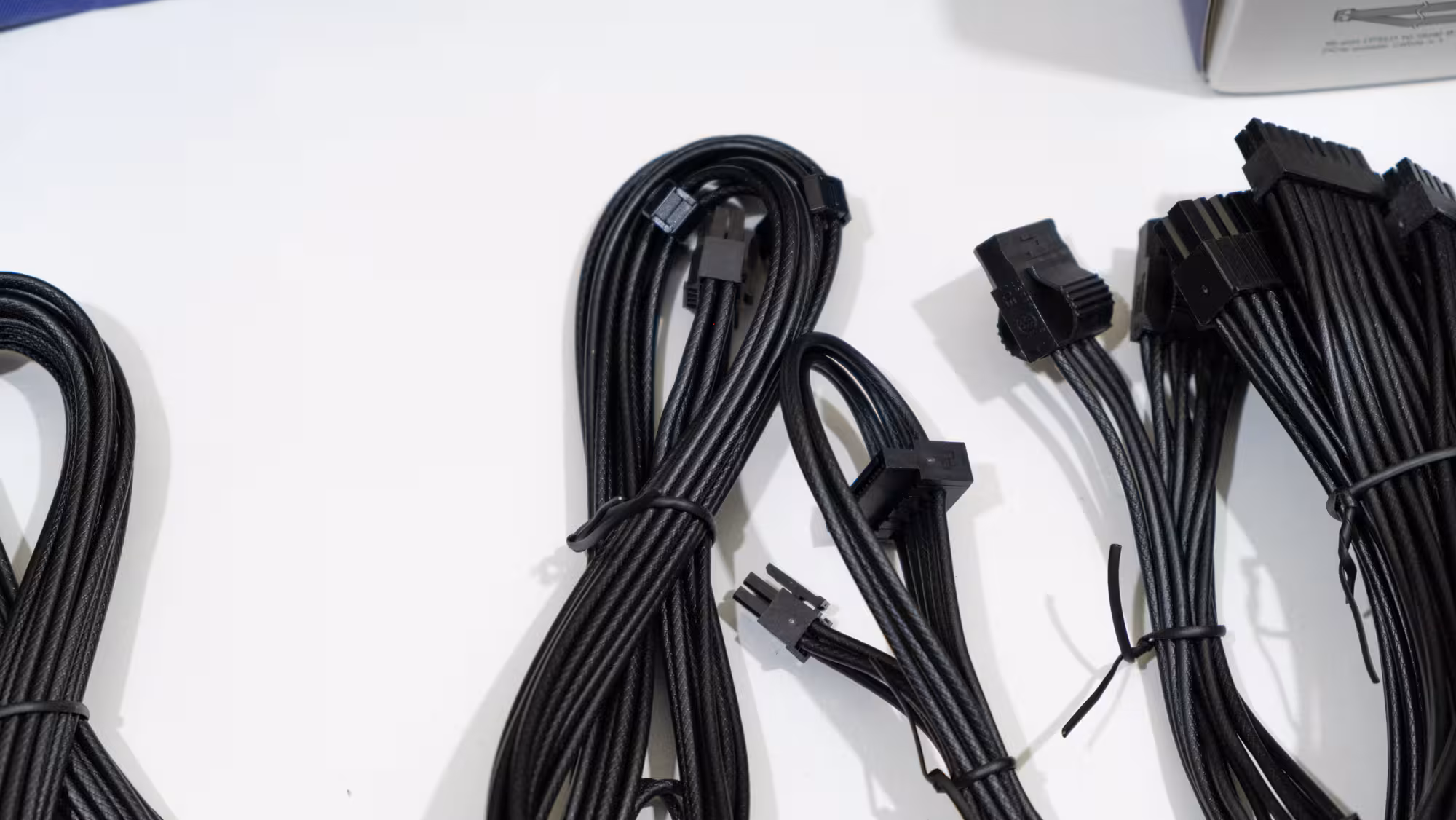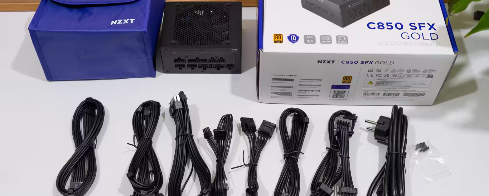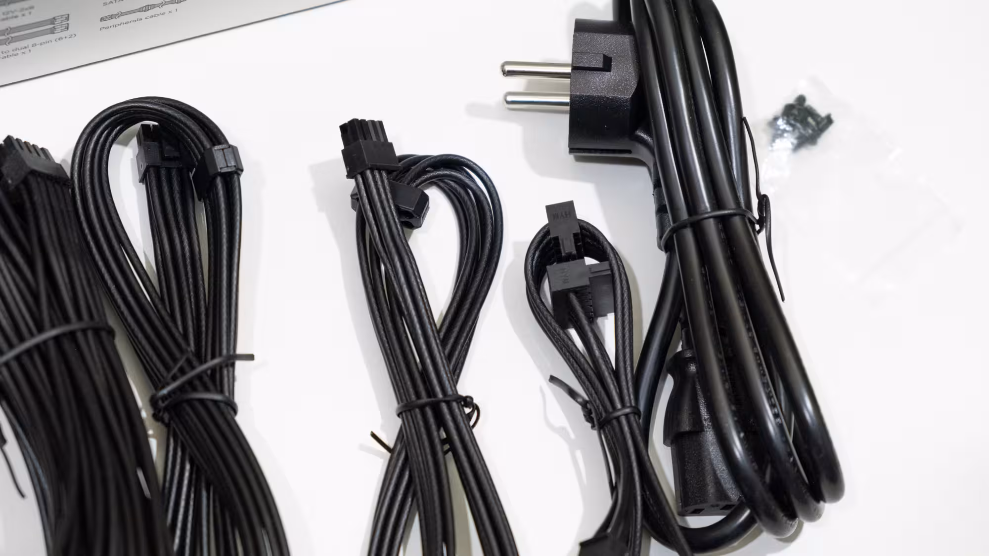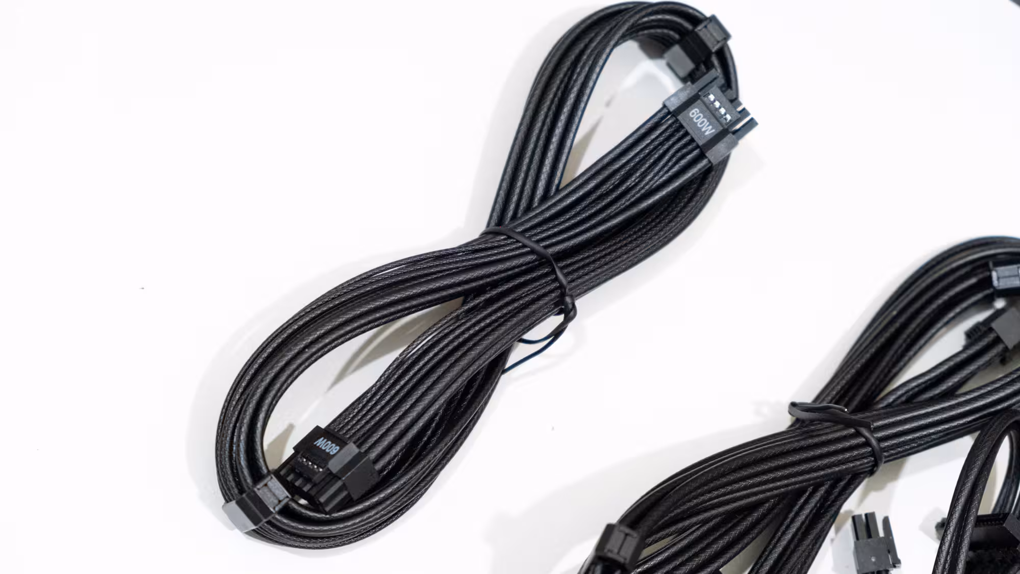NZXT aporta los siguientes cables: uno ATX de 350 mm, uno EPS de 470 mm, uno de 6+2 pines de 470 mm, dos de 16 pines (12V-2x6) a PCIe de 6+2 pines, uno de 16 pines a 16 pines de 470 mm que puede usarse para entregar hasta 600 W, seis SATA de 100+100 mm, y tres mólex de 100+100 mm. Es una cantidad adecuada para el propósito y orientación tanto de la fuente de alimentación como de los equipos en que se instalará.