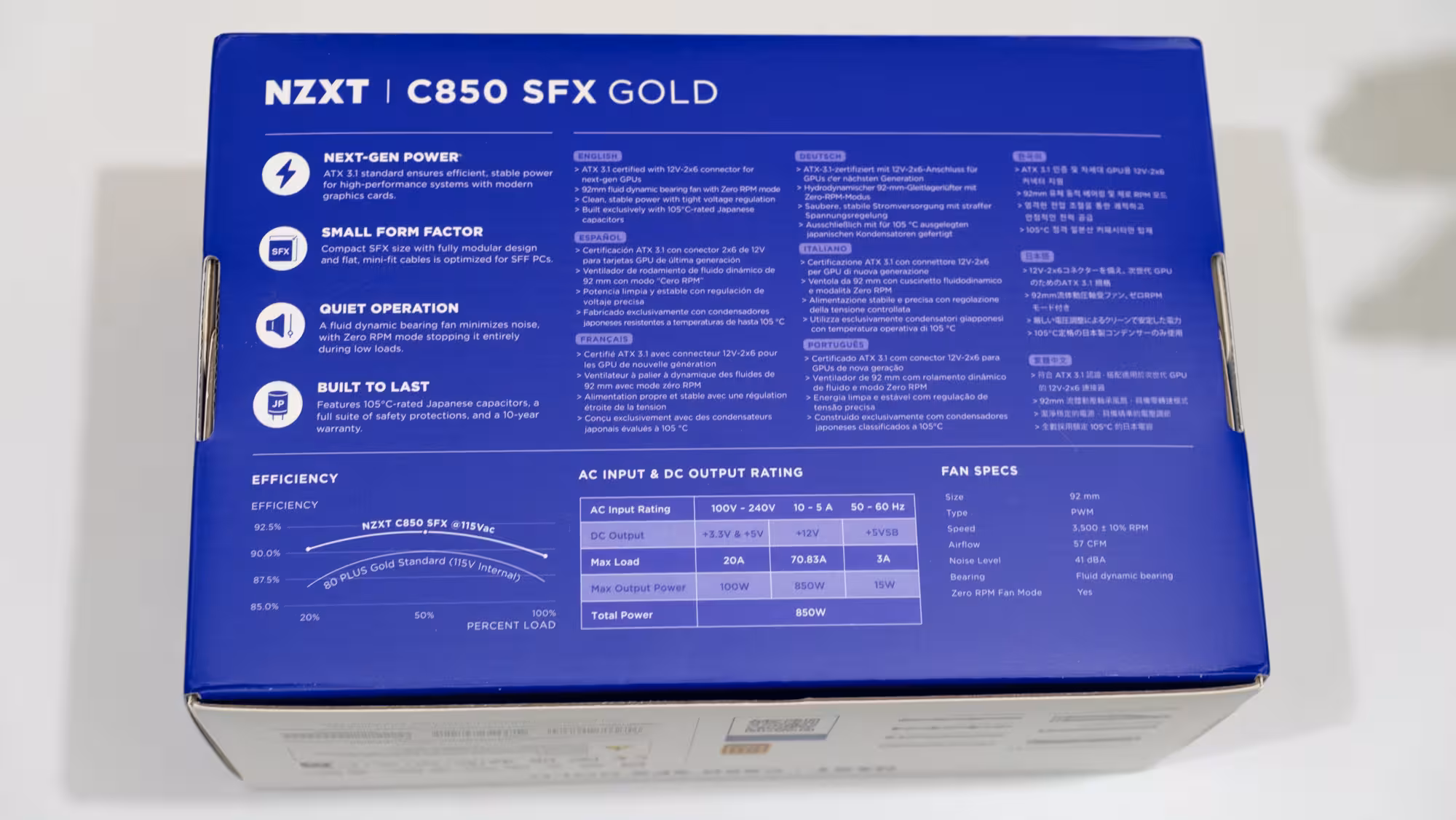 La C850 SFX Gold de NZXT en una caja blanca y violeta azulado, con toda la información necesaria para saber el producto que se está comprando. Eso incluye los certificados, generalidades sobre sus componentes, y hasta las características del ventilador que incluye y que se puede consultar en la parte trasera de la caja.