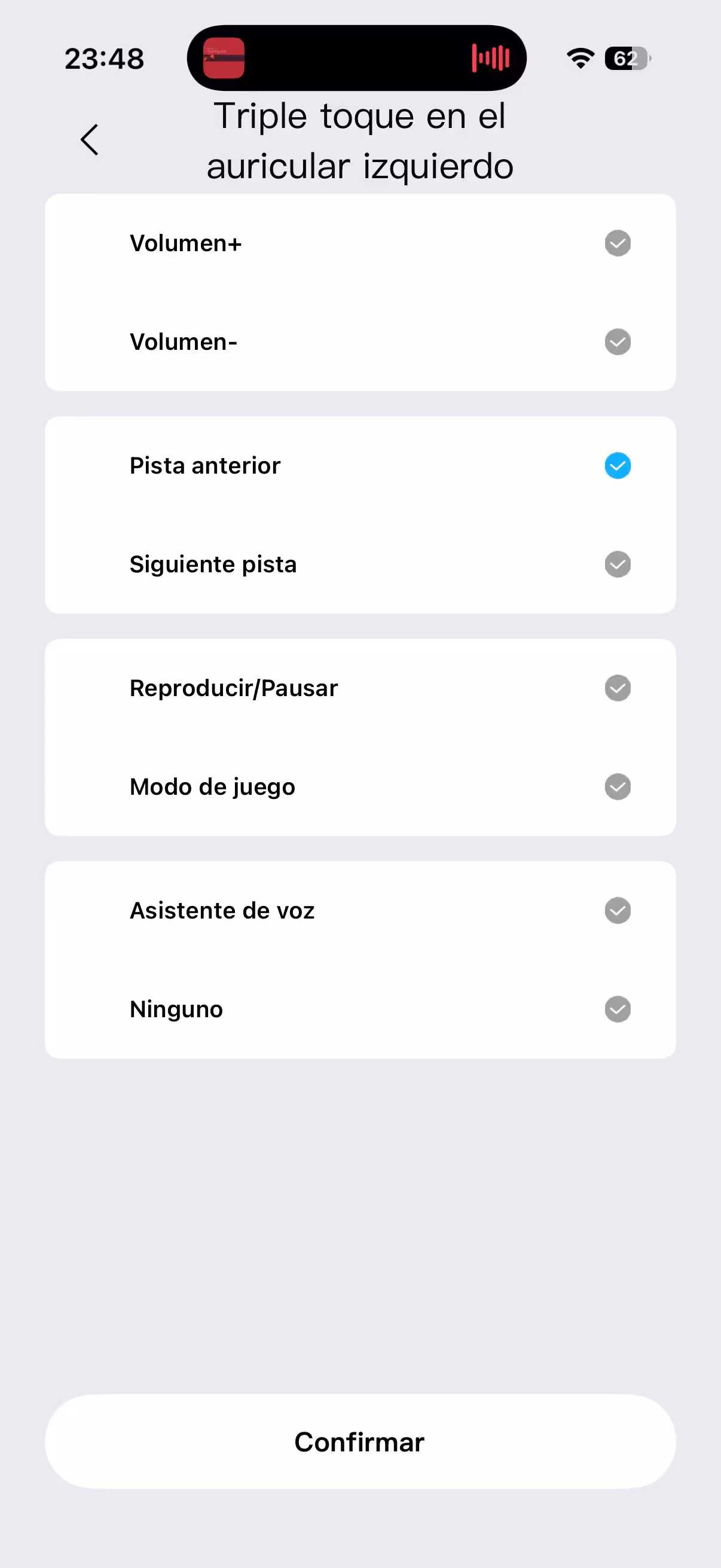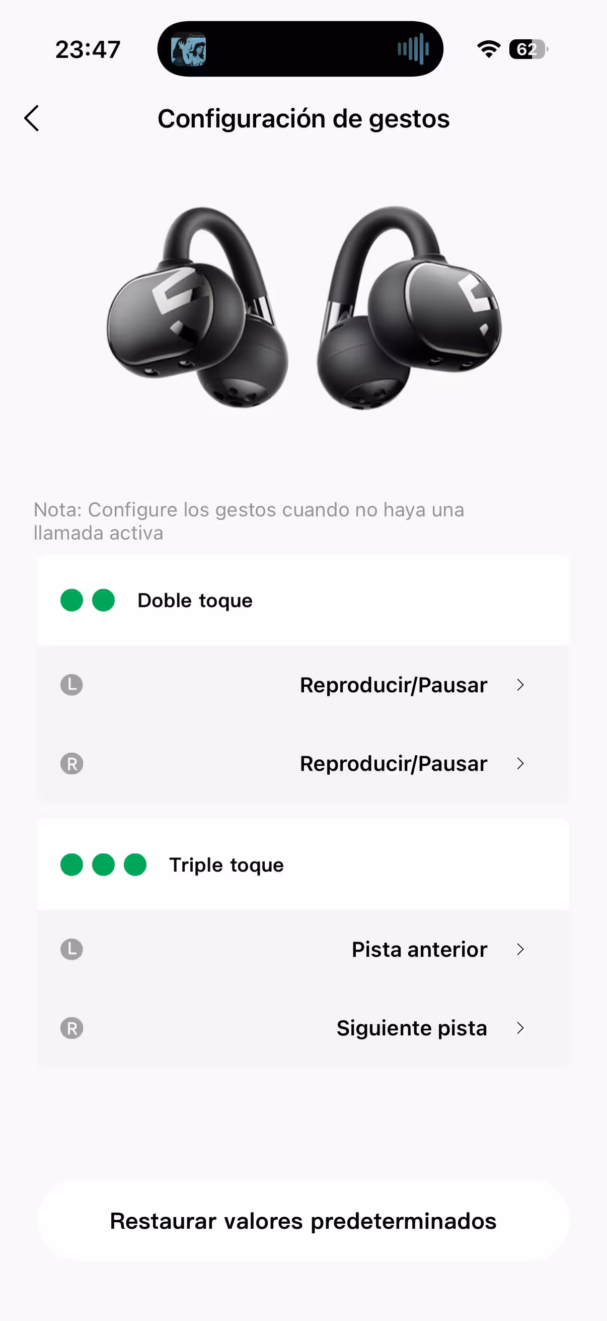La otra característica importante para la que sirve la aplicación es para configurar los gestos táctiles en la superficie de los pinganillos. Como he dicho antes, hay que acostumbrarse a la forma de realizar los toques sobre su superficie, y algunos como el triple toque son un poco más erráticos. Pero las opciones para los gestos son las que son y no hay ningún otro que no esté ya asignado.