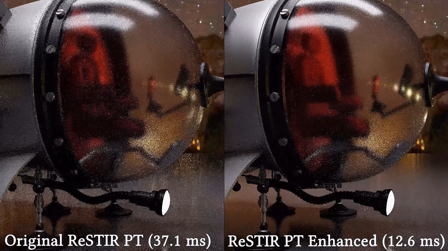 Como esta mejora a ReSTIR PT reduce el tiempo de generación, lo hace a través de una reducción de errores en el cálculo de los mejores rayos, lo cual reduce el ruido, obteniéndose más precisión, y al final mejora la calidad final del fotograma. Para ello añade nuevas técnicas de mapas de duplicación, mejora los mapeos de cambios de escena, y otras. Cosas que no van a tener un impacto inmediato en el rendimiento.