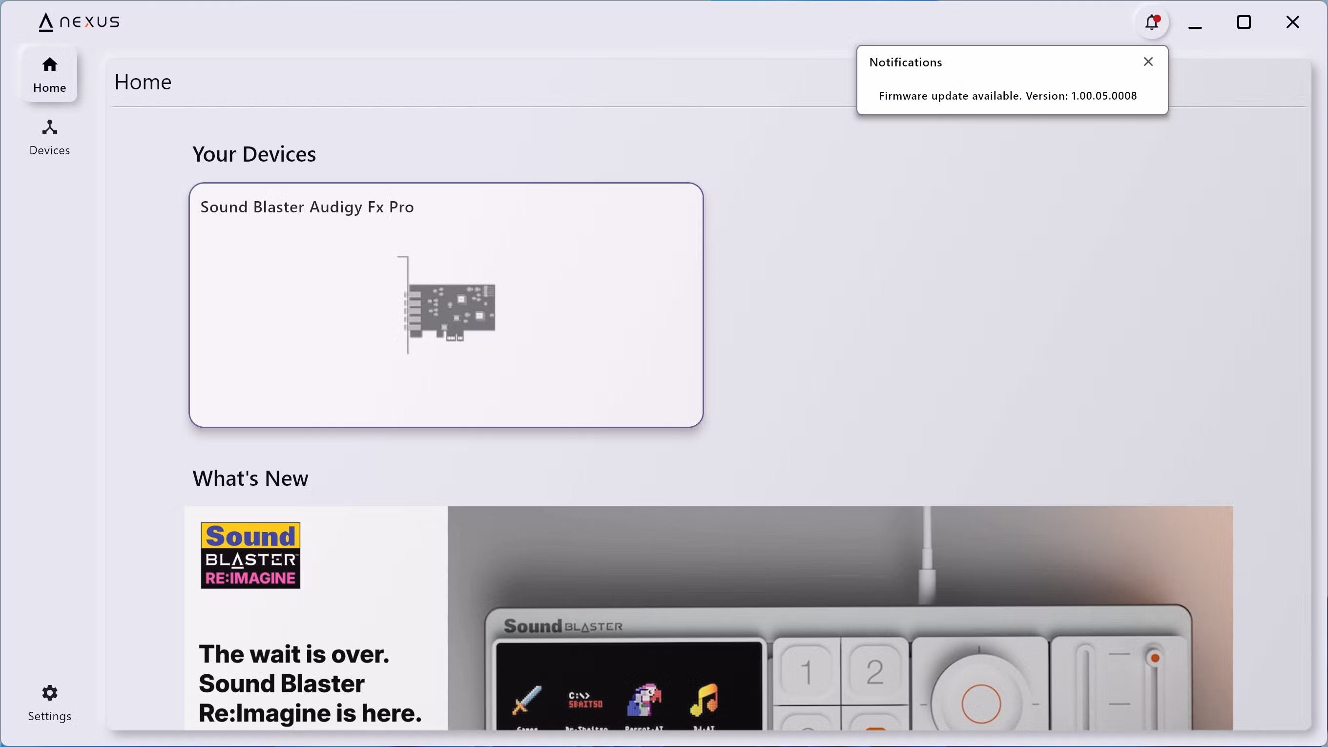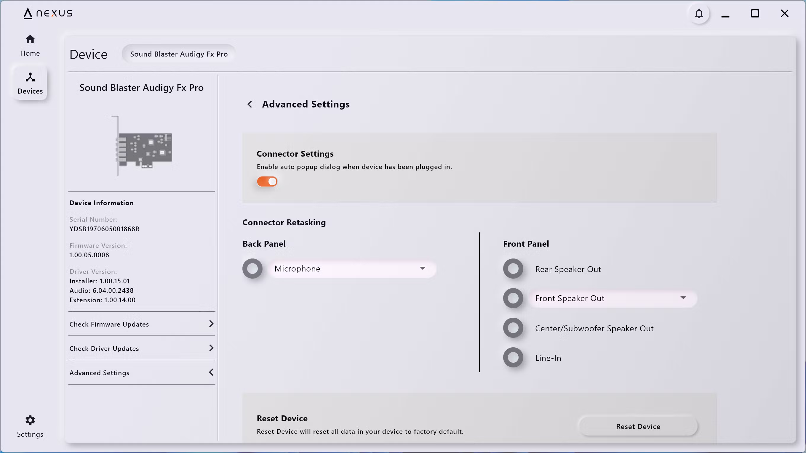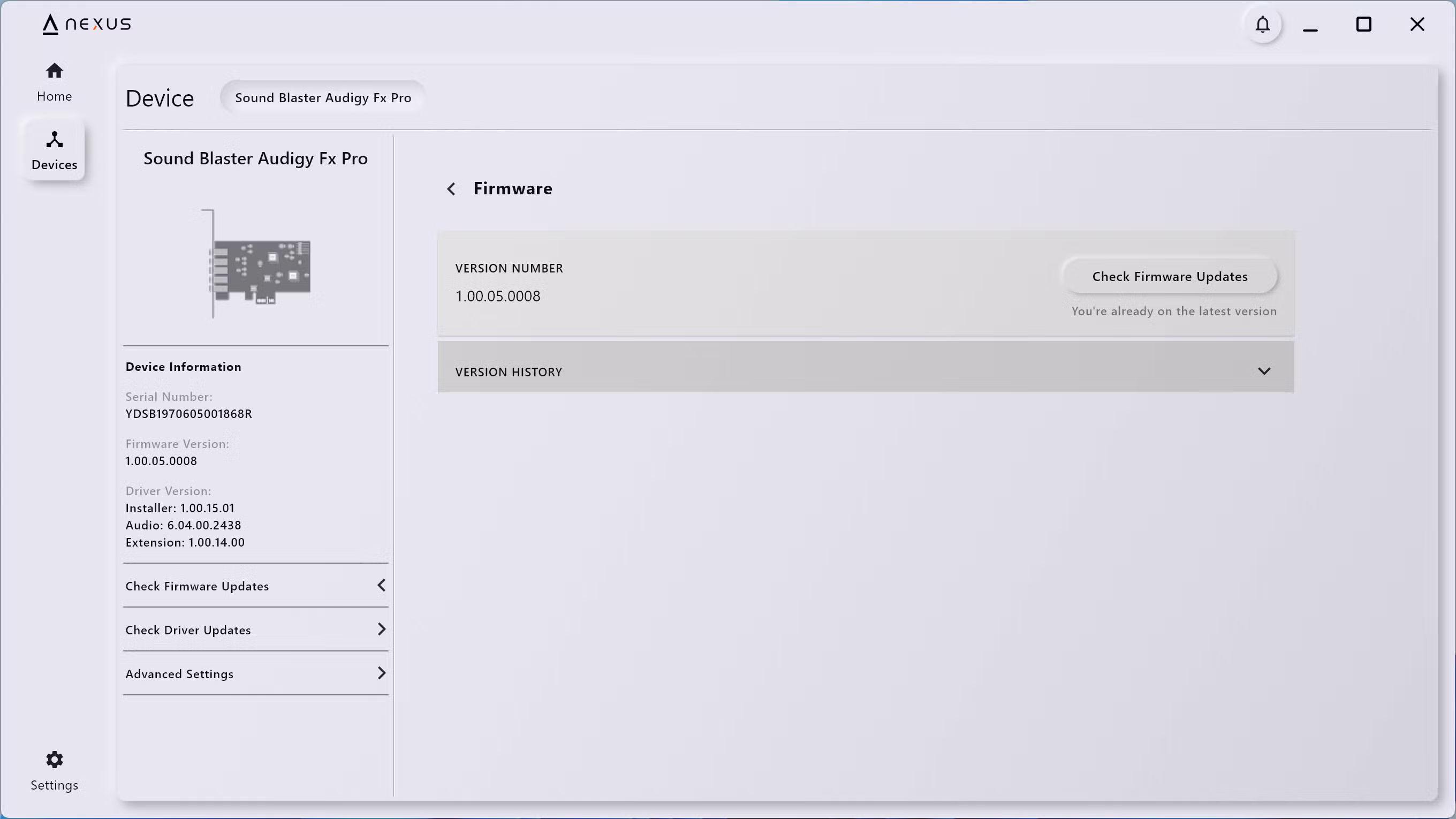 La configuración de la Audigy FX Pro se hace a través de Nexus, un programa de configuración bastante sencillo que básicamente sirve para dos cosas: actualizar el firmware y ecualizar el audio. En lo primero, bueno, tras instalarla hay que hacer dos actualizaciones de firmware. La primera pide reiniciar el ordenador, y la segunda no hace falta. No son lentas ni rápidas, pero lleva cinco a diez minutos hacerlo todo.