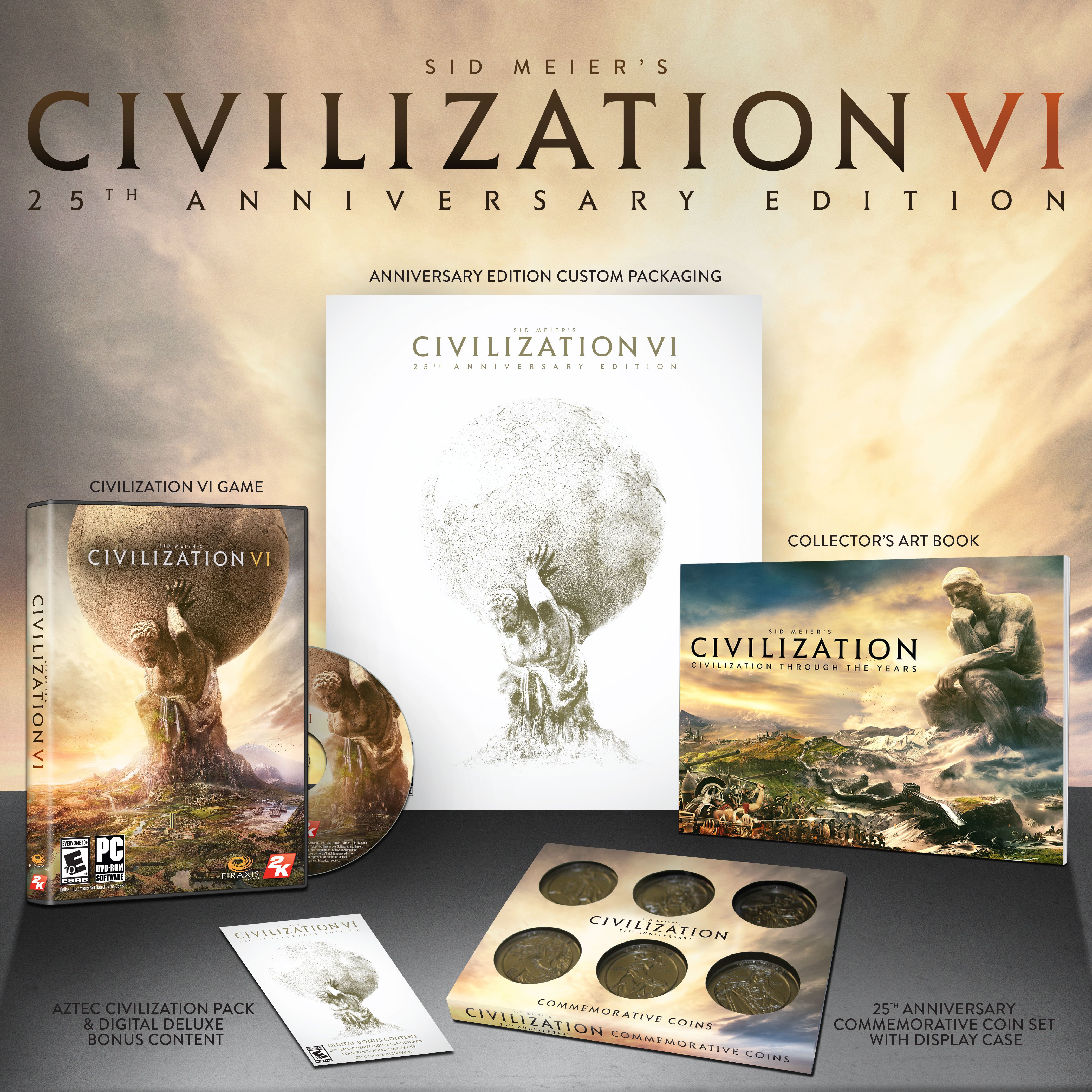 Además del juego completo de Sid Meier’s Civilization VI y todo el contenido digital adicional que aparece en la edición digital de lujo (banda sonora y cuatro paquetes descargables), también incluye un libro de ilustraciones a color de 100 páginas y tapa dura, Civilization a través de los años, una colección exclusiva de monedas conmemorativas del 25.º aniversario con estuche expositor y la civilización azteca; y todo ello envuelto en un empaquetado especial exclusivo de este aniversario. Esta edición se pondrá al a venta a la vez que el juego, el 21 de octubre.