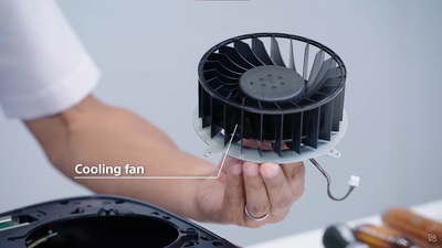 Y ahora comienza el despiece propiamente dicho, no sin antes recordar que a partir de aquí, queda invalidada la garantía en caso de hacerlo en casa. Lo primero en extraer es su ventilador de 120 mm de diámetro y 45 mm de grosor, que como ya se dijo, es capaz de recoger aire por ambos lados. Esto es algo que, junto con el aumento de tamaño, seguro que ayuda a la consola a estar más refrigerada y evitar el tremendo ruido que emitía la PS4 debido a su sistema de ventilación.