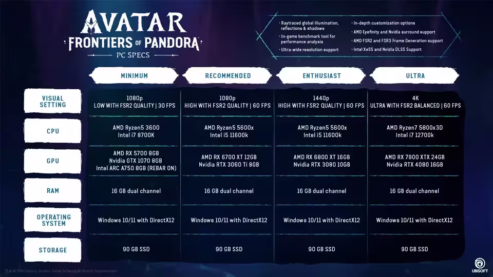 Los mínimos (FHD, 'bajo', FSR 2 en 'calidad', 30 f/s) piden un Ryzen 5 3600 o un i7-8700K con una RX 5700, GTX 1070 o Arc A750, con 16 GB de RAM en doble canal y 90 GB de espacio en disco. Para los recomendados (FHD, 'alta', FSR 2 en 'calidad', 60 f/s) se pide un Ryzen 5 5600X o un i5-11600K, con una RX 6700 XT o una RTX 3060 Ti.