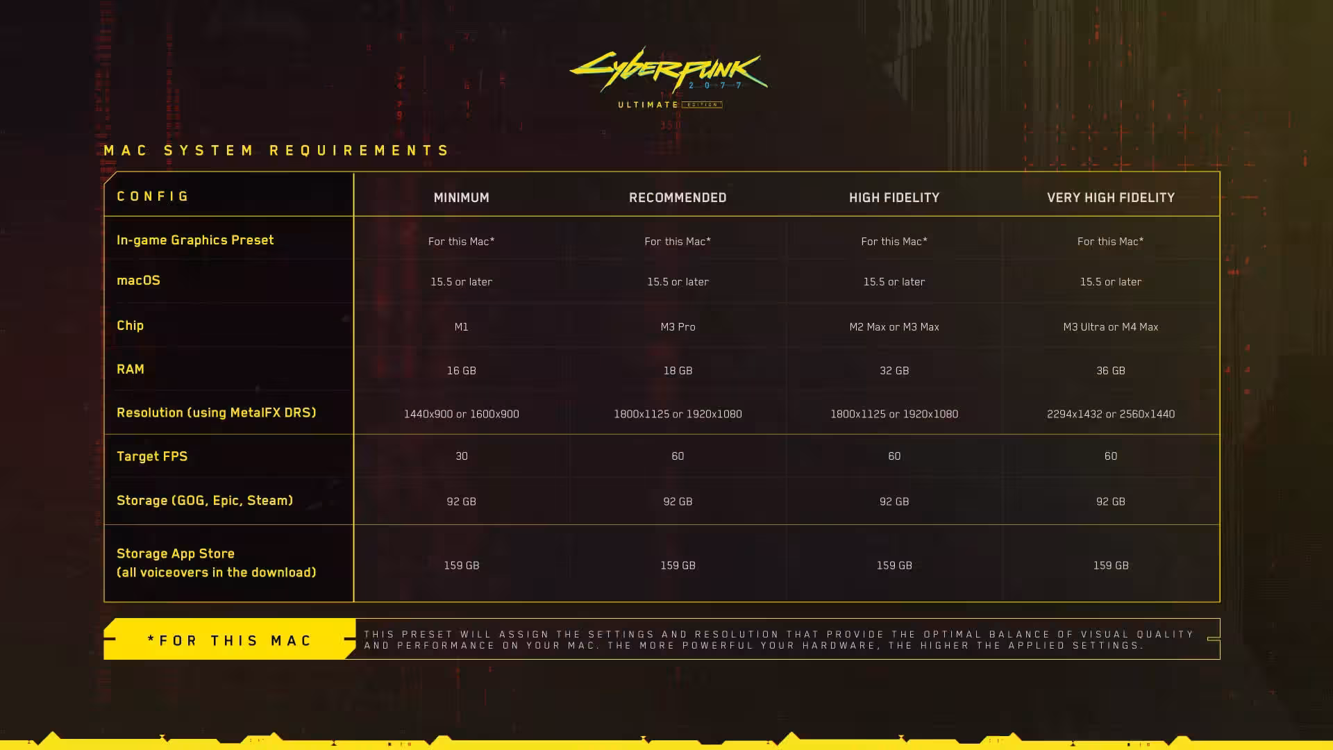 Los requisitos mínimos son un Mac con un M1 y 16 GB de RAM para jugar a 1600 × 900 píxeles, o en un MacBook a 1440 × 900 píxeles y 30 f/s. El juego ocupa 159 GB en la App Store porque es la versión completa, y a partir de 92 GB en Steam, GOG y Epic Games.