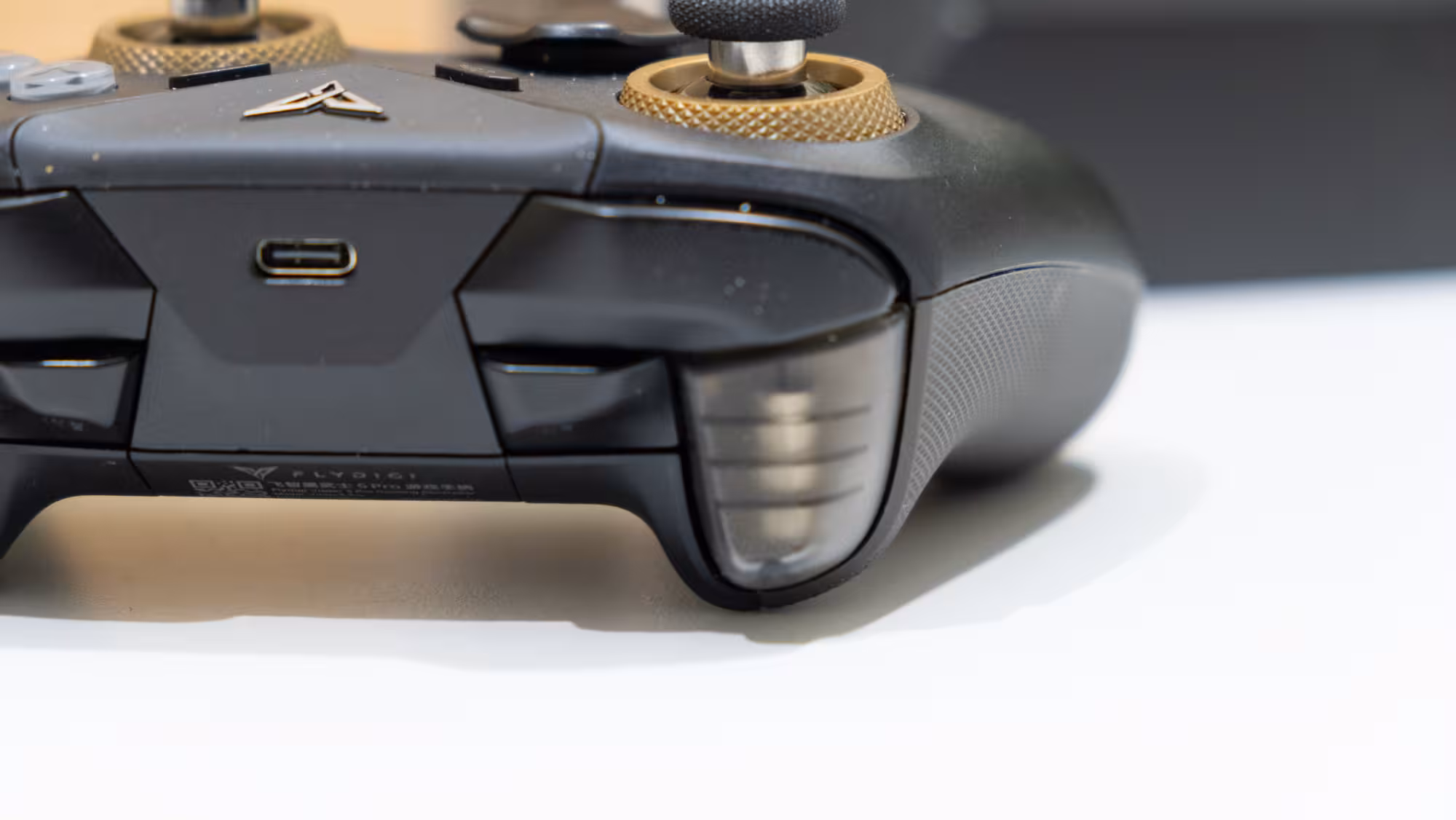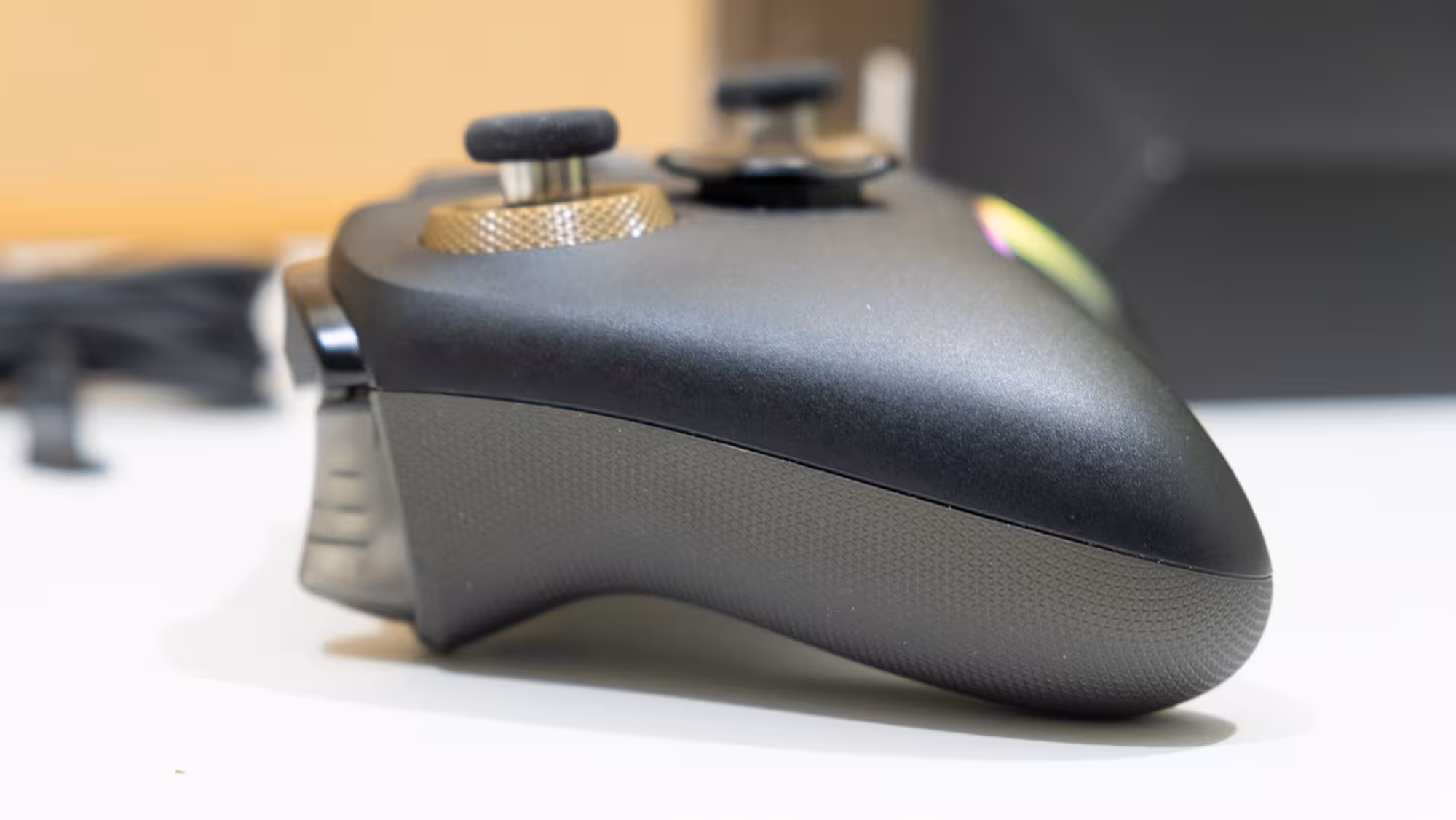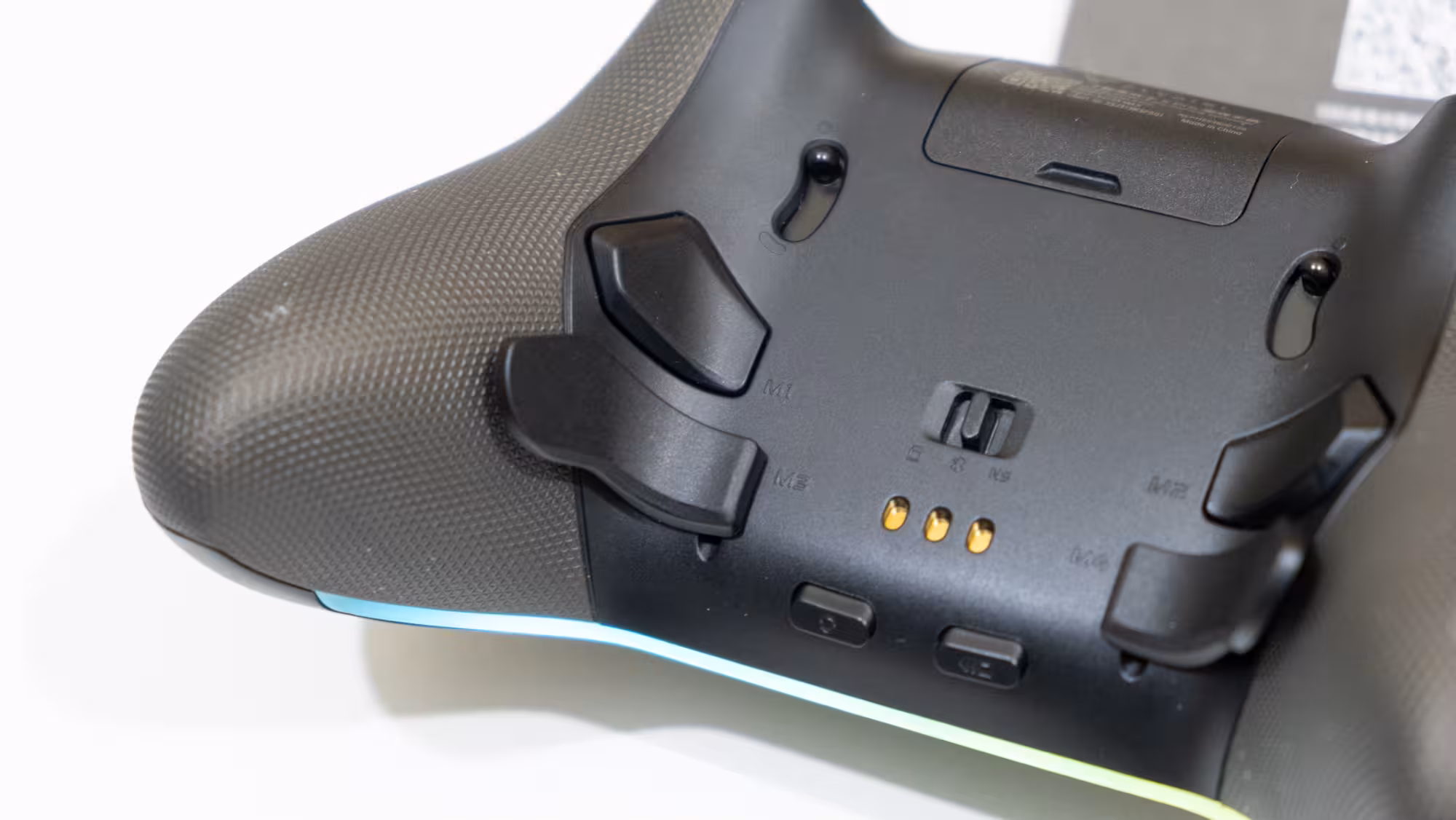 En la parte superior esta la toma USB-C, además de los habituales botones de acción frontales con cierta rugosidad, los dos gatillos, y dos botones adicionales que suelen ser muy útiles para macros o acciones específicas de más fácil acceso. Los gatillos tienen un diseño bastante bueno, siendo además gatillos progresivos, y en principio no hay que configurar nada para usarse así. En la parte posterior hay limitadores de recorrido con los que pasarán a funcionar como botones con microinterruptores de una sensación de uso similar a los de la botonera.