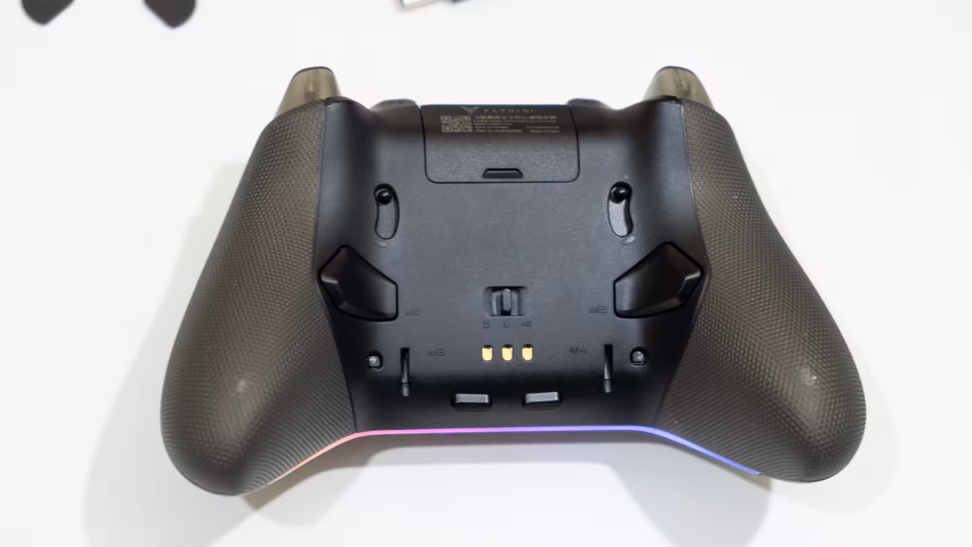 En el frontal está el logo de Flydigi en la parte superior que servirá para encender el mando. Están los dos botones adicionales de los mandos de Xbox (vista y menú), por aquello de que es un clon en formato de estos mandos. La botonera incluye cuatro botones con microinterruptores, de muy buena sensación de uso, aunque no me guste para todos los juegos porque son de actuación más rápida que los del Xbox Elite, por ejemplo.