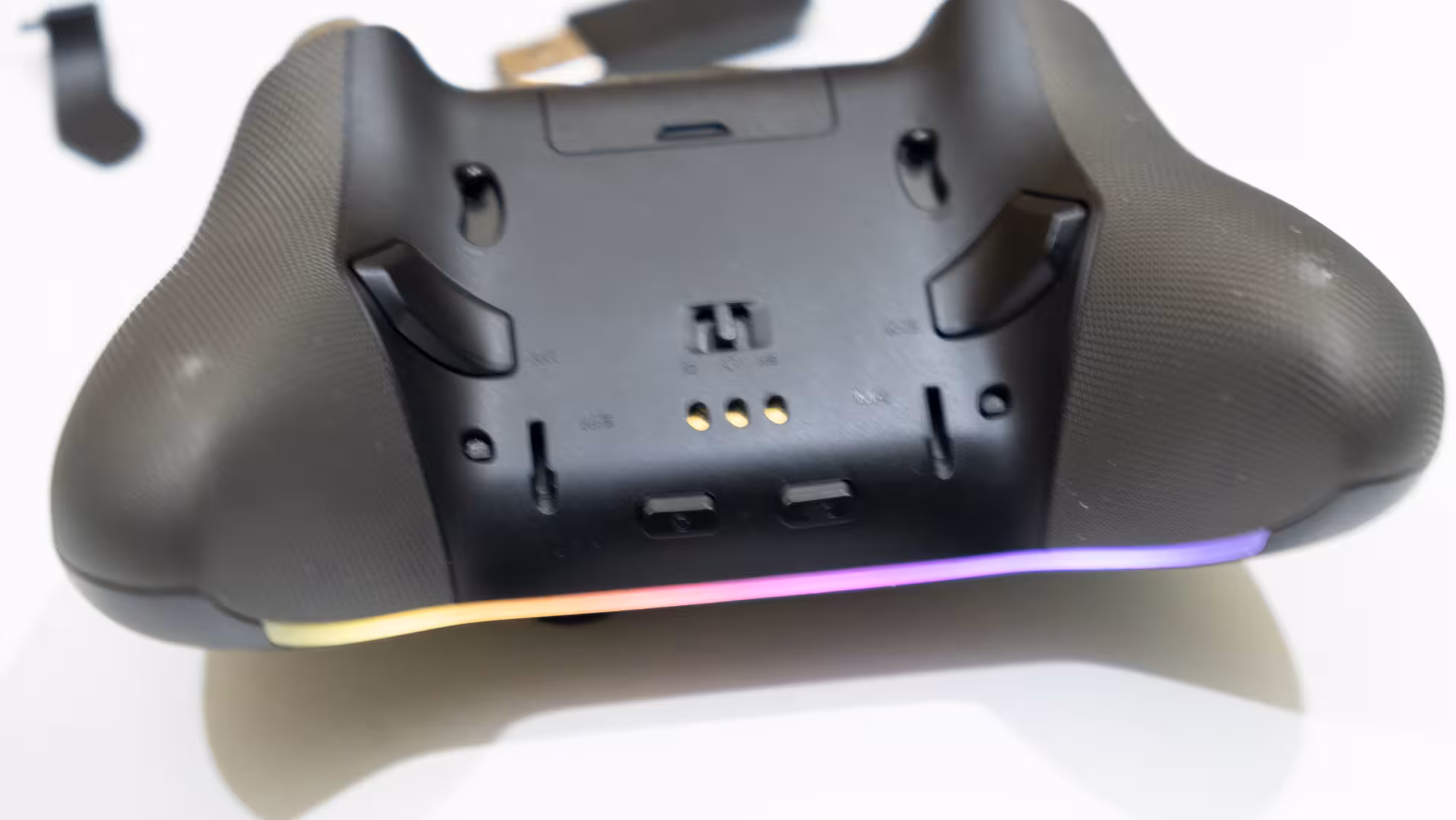 El peso, la sensación de uso y la posición de los controles me parecen ideales. En ese terreno me parece un mando soberbio, reforzado por la franja de iluminación ARGB que tiene en la parte inferior. Mide 102 mm × 154 mm × 65 mm mm, por lo que si no es exactamente el tamaño del Xbox Elite debe haber una mínima variación.
